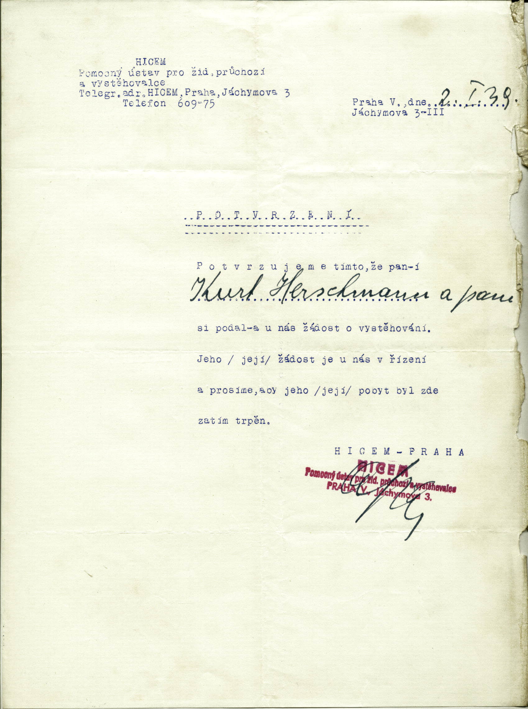 Herschmannová Greta: Potvrzení o registraci k vystěhování