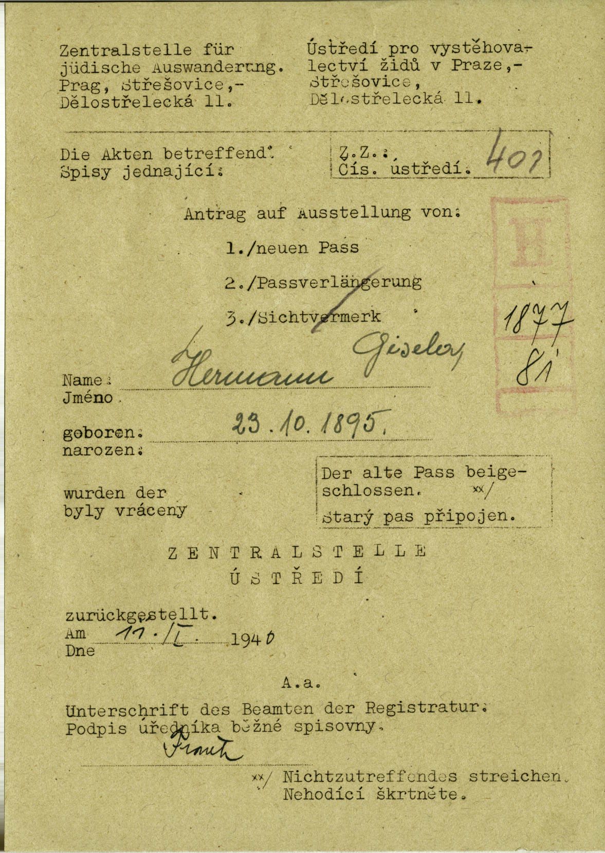 Herrmannová Gisela: Záznam o vrácení spisu Zentralstelle