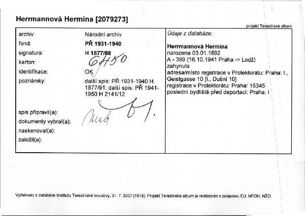 This database contains the names and fates of those who were deported from the territory of today’s Czech Republic, be it their homeland or may they have been deported to the Theresienstadt ghetto before from different european countries. Further, it contains basic information on those men, women and children, most of whom were Roma or Sinti, who died as prisoners of the so-called „Gypsy camp I“ Lety u Písku.