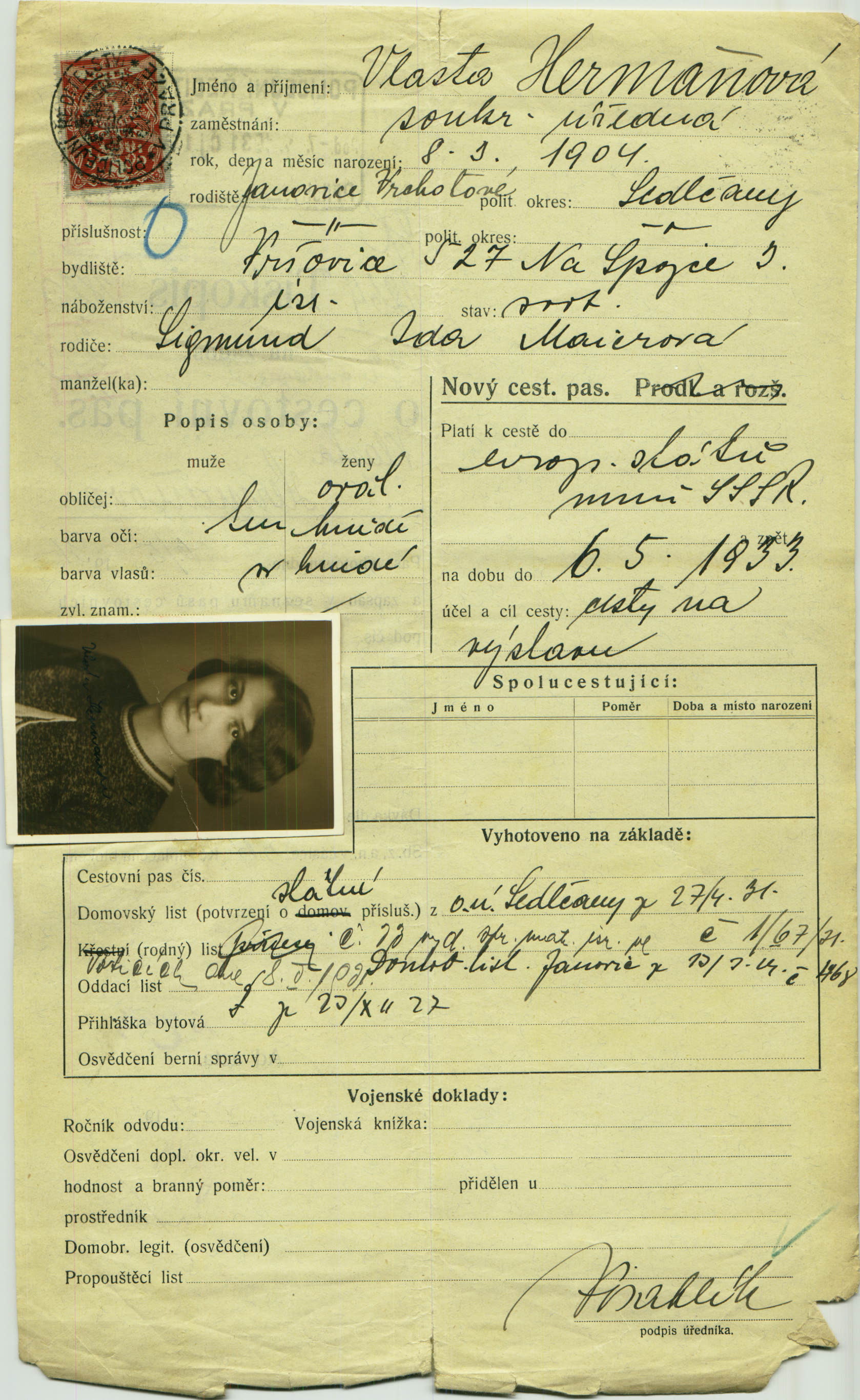 Hermannová Vlasta: Žádost o vydání cestovního pasu