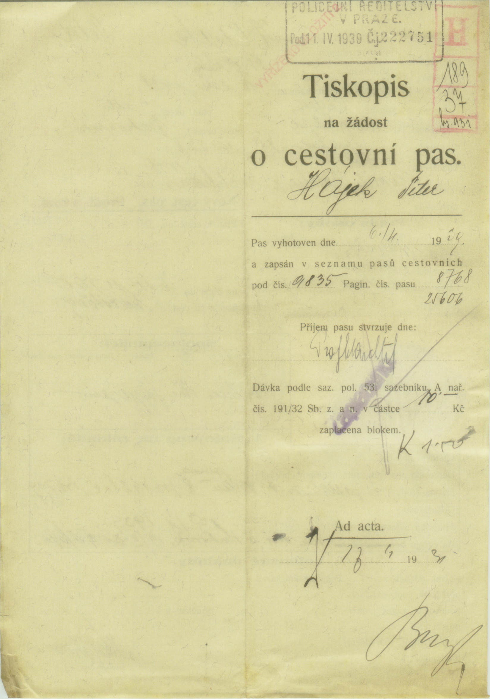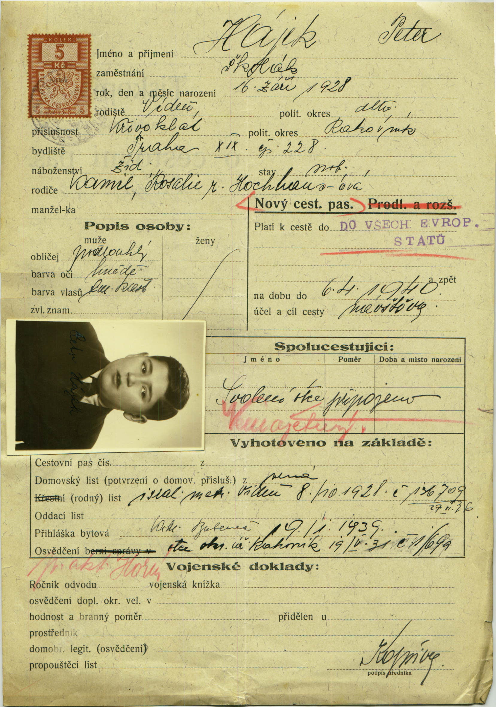 Hajek Petr: Žádost o vydání cestovního pasu