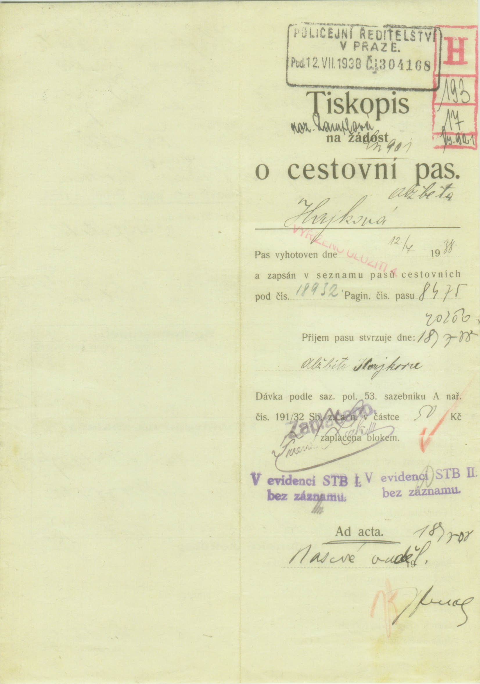 Hájková Alžběta: Žádost o vydání cestovního pasu