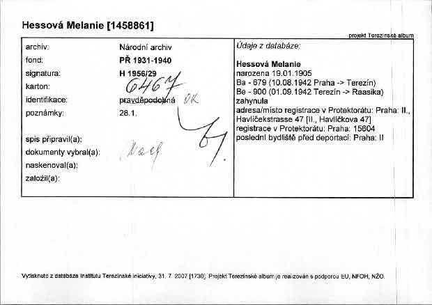 For publication purposes, contact the National Archives in Prague, where the original document is located. The document was digitized by the Terezín Initiative Institute, the Terezín Album project
