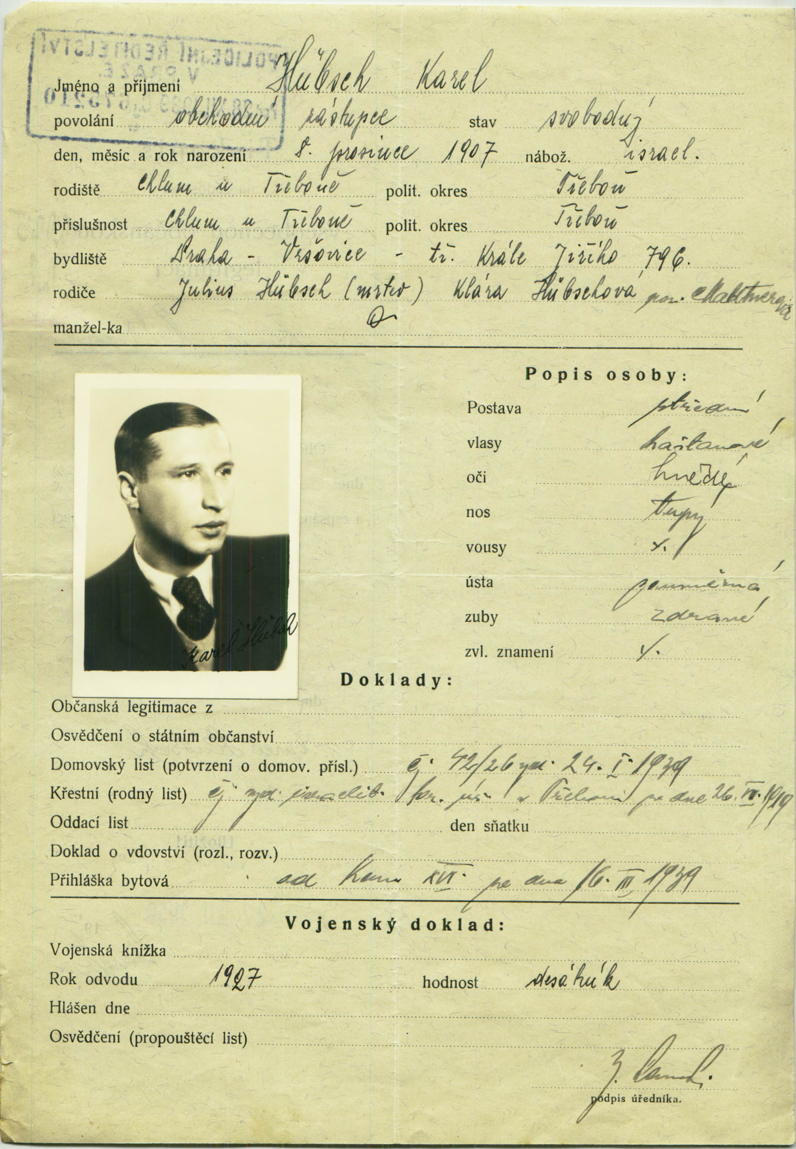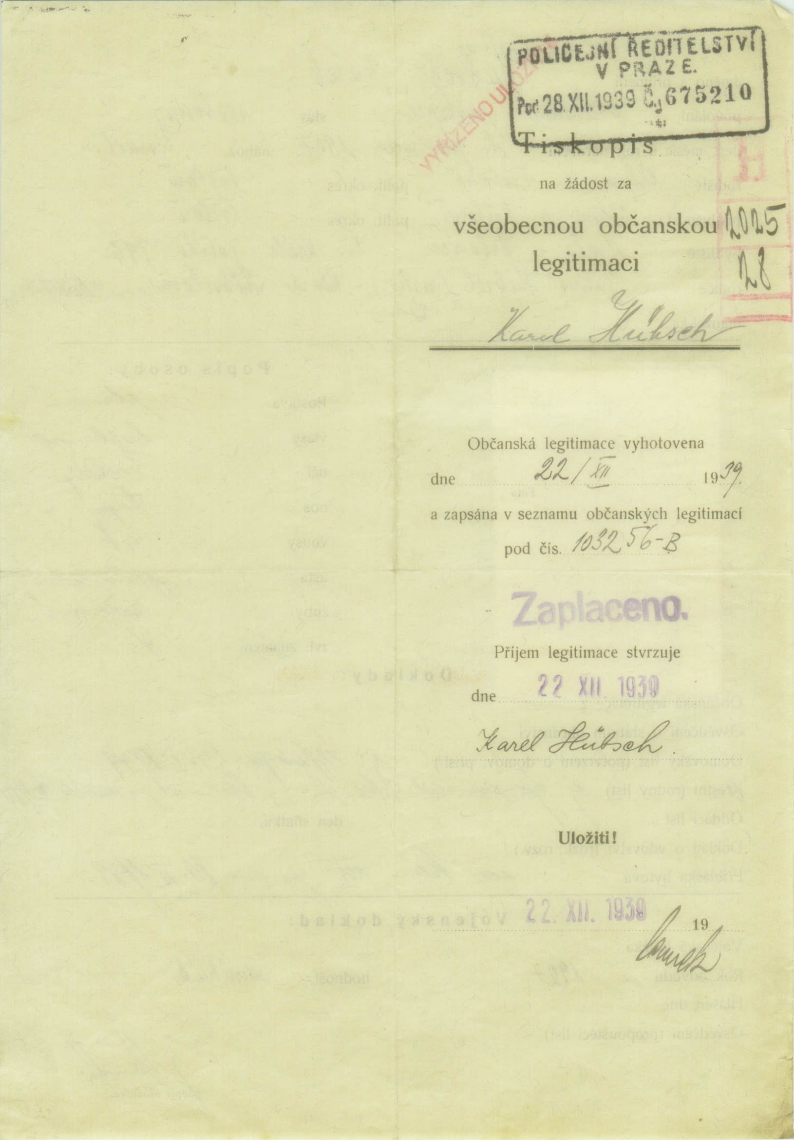 Hübsch Karel: Žádost o vydání občanské legitimace