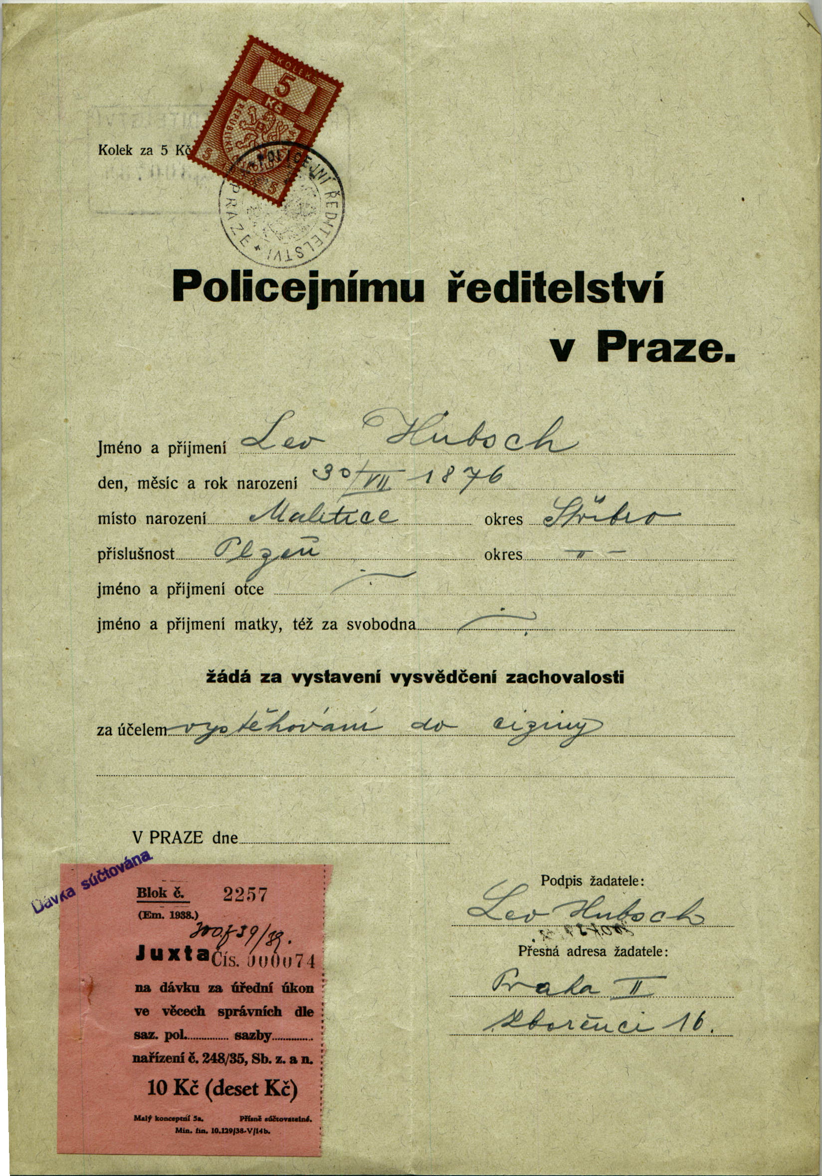 Huebsch Leo: Žádost o vystavení vysvědčení zachovalosti