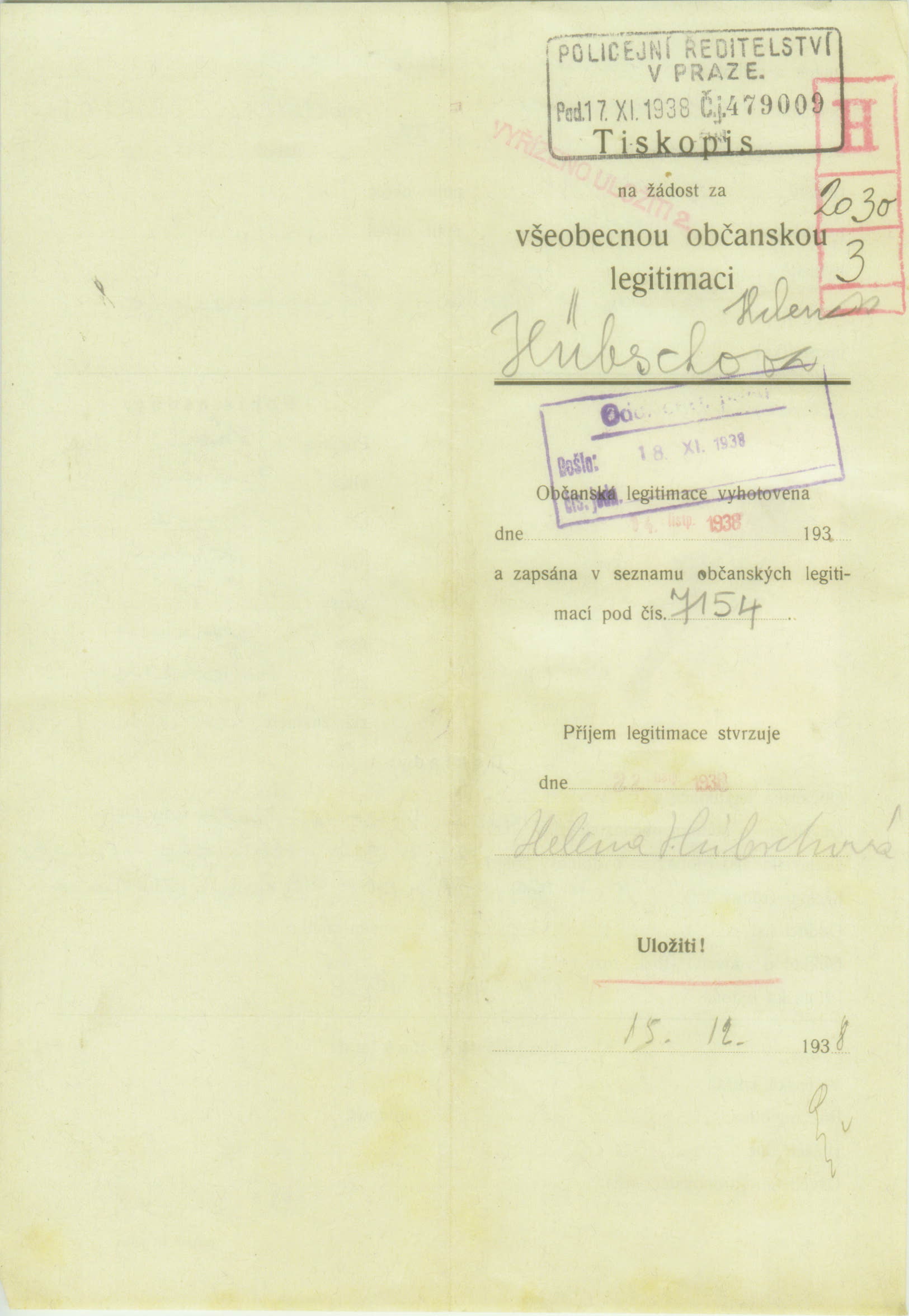 Hübschová Helena: Žádost o vydání občanské legitimace