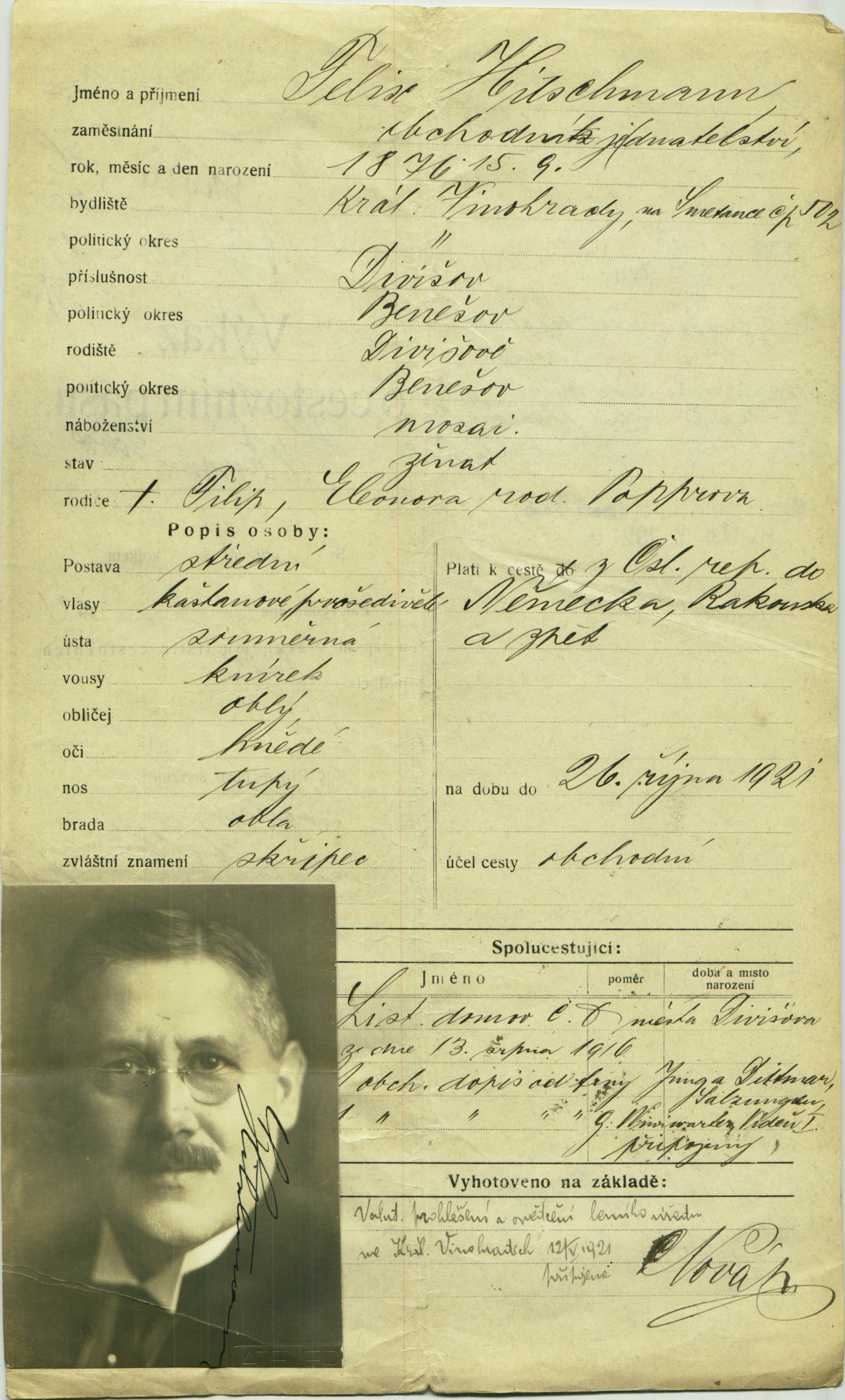 Hitschmann Felix: Žádost o vydání cestovního pasu