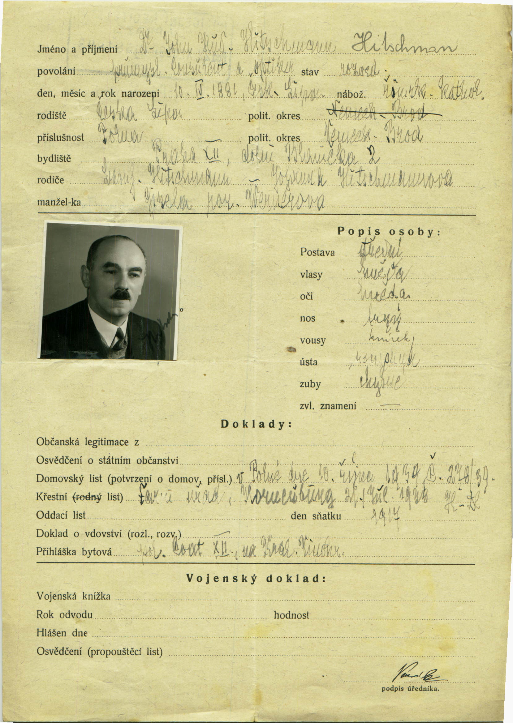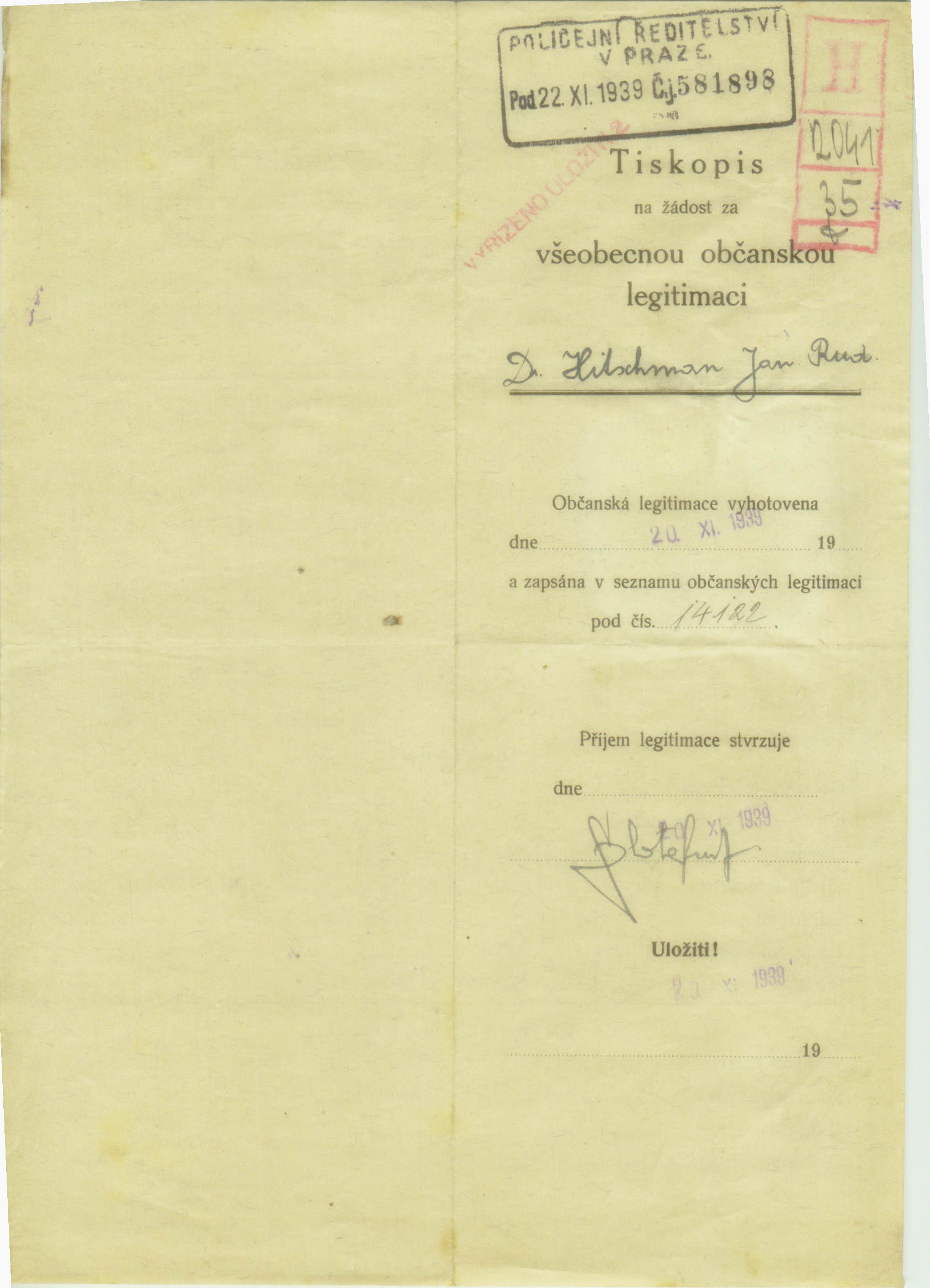 Hitschmann John Rudolf: Žádost o vydání občanské legitimace