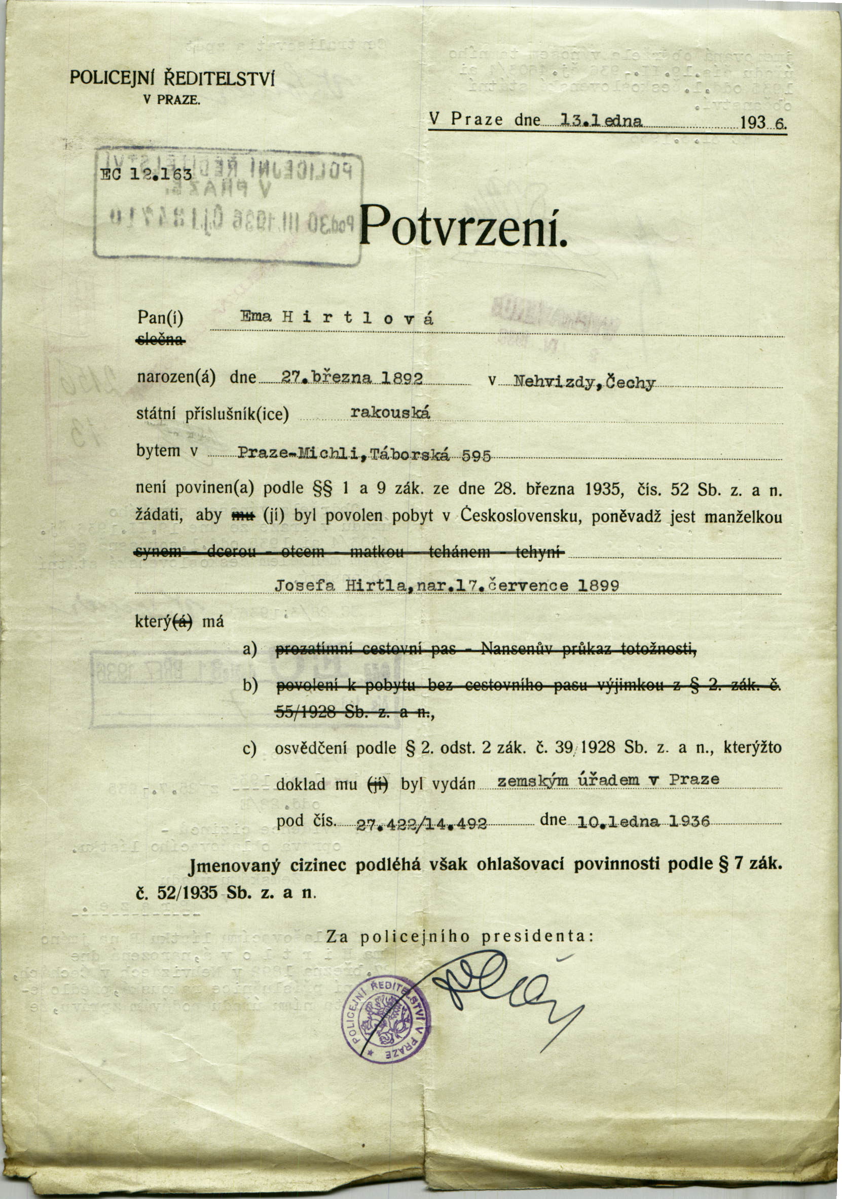 Hirtlová Emilie: Šetření o státní příslušnosti