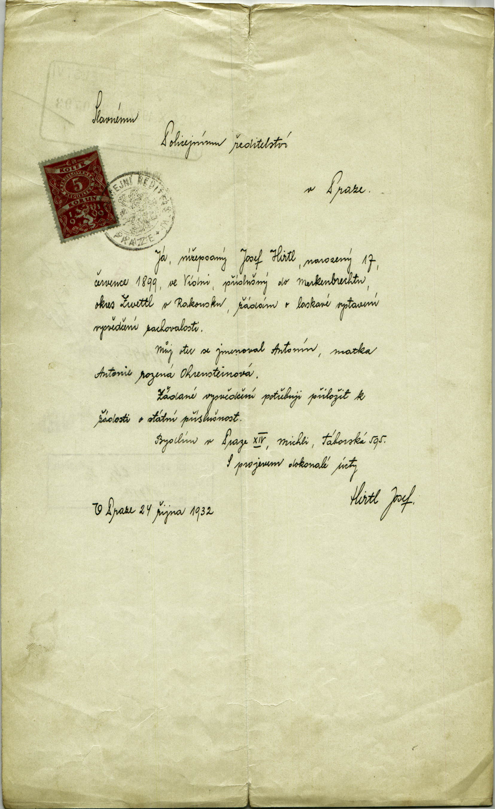 Hirtl Josef: Žádost o vystavení vysvědčení zachovalosti