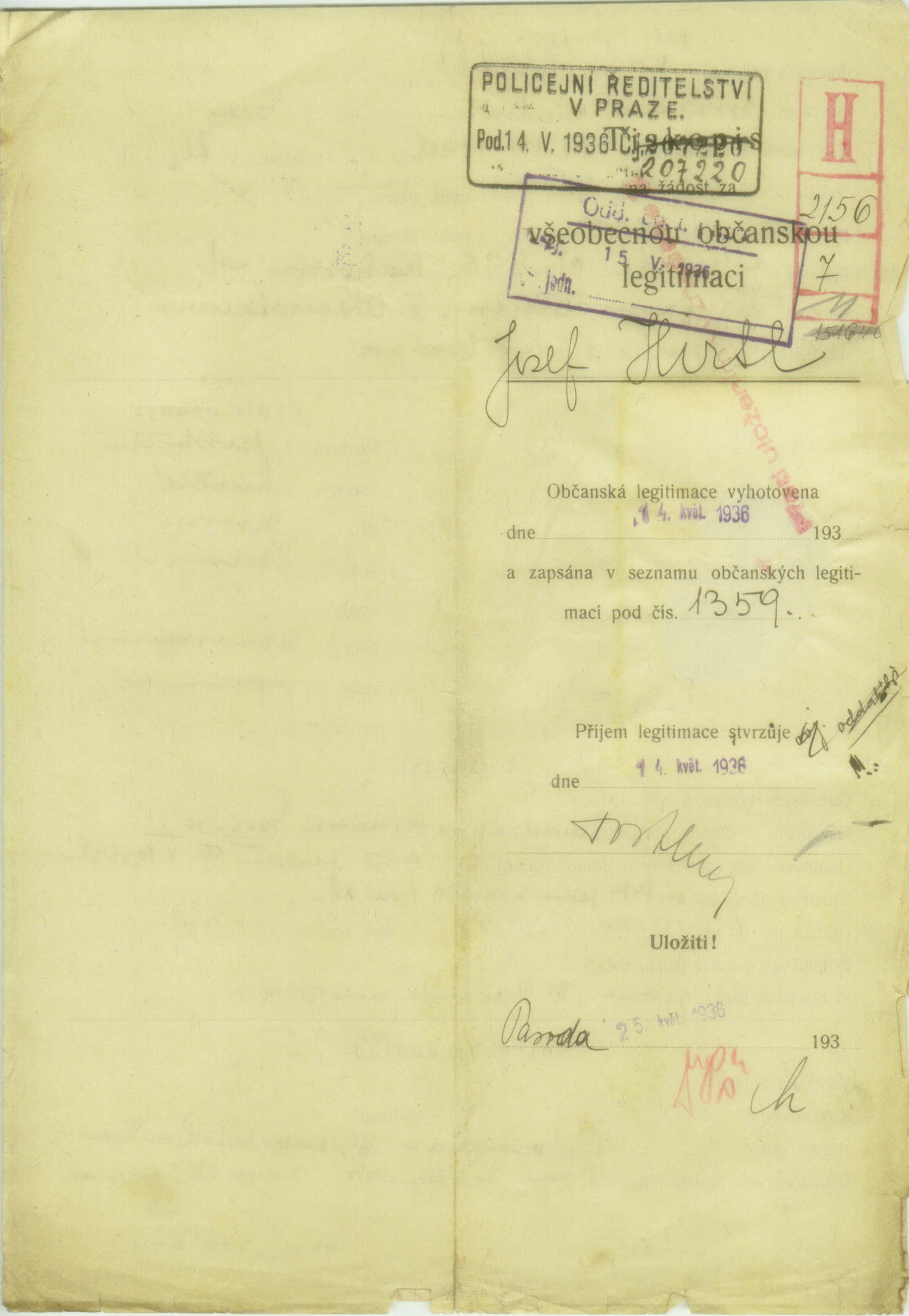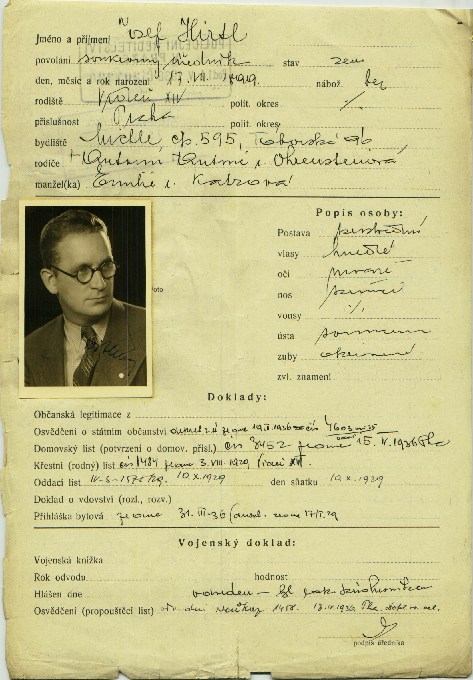 Hirtl Josef: Žádost o vydání občanské legitimace