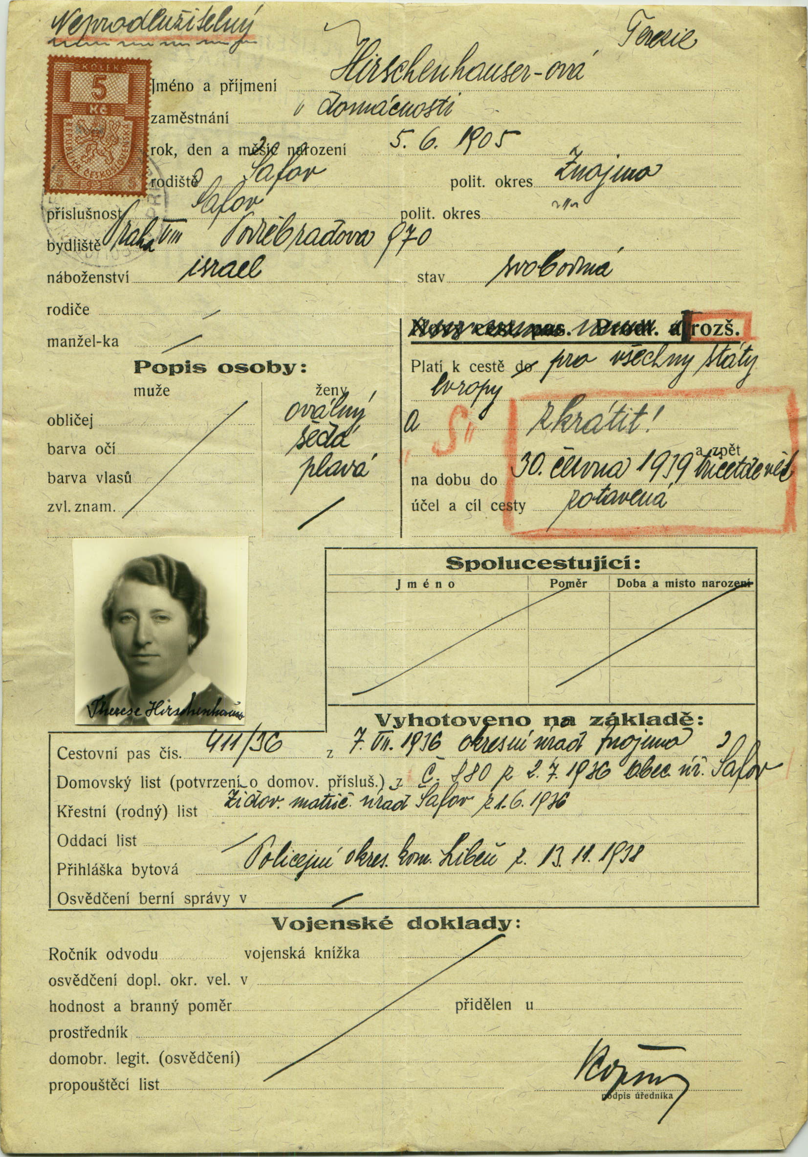 Hirschenhauserová Terezie: Žádost o rozšíření cestovního pasu