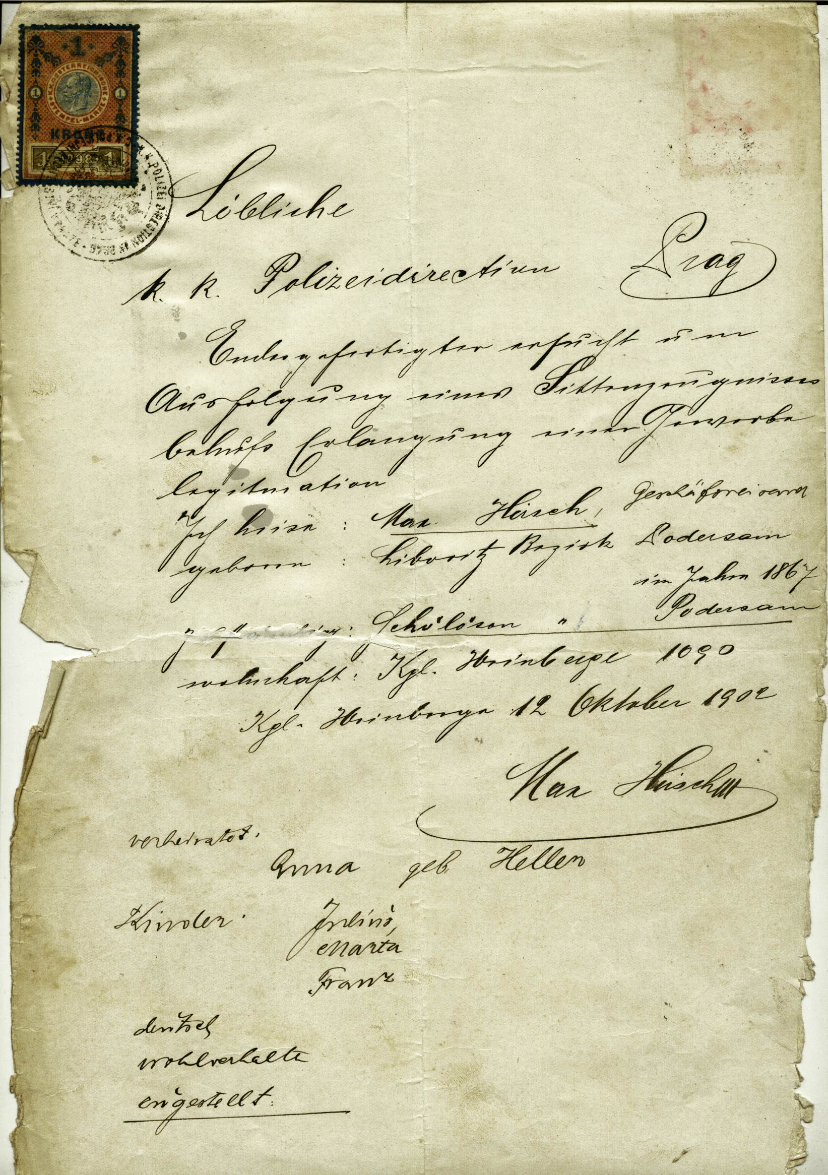Hirsch Maximilian: Žádost o vystavení vysvědčení zachovalosti