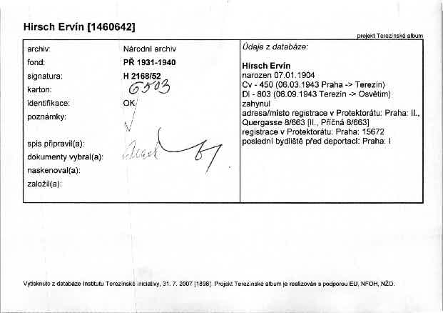 This database contains the names and fates of those who were deported from the territory of today’s Czech Republic, be it their homeland or may they have been deported to the Theresienstadt ghetto before from different european countries. Further, it contains basic information on those men, women and children, most of whom were Roma or Sinti, who died as prisoners of the so-called „Gypsy camp I“ Lety u Písku.