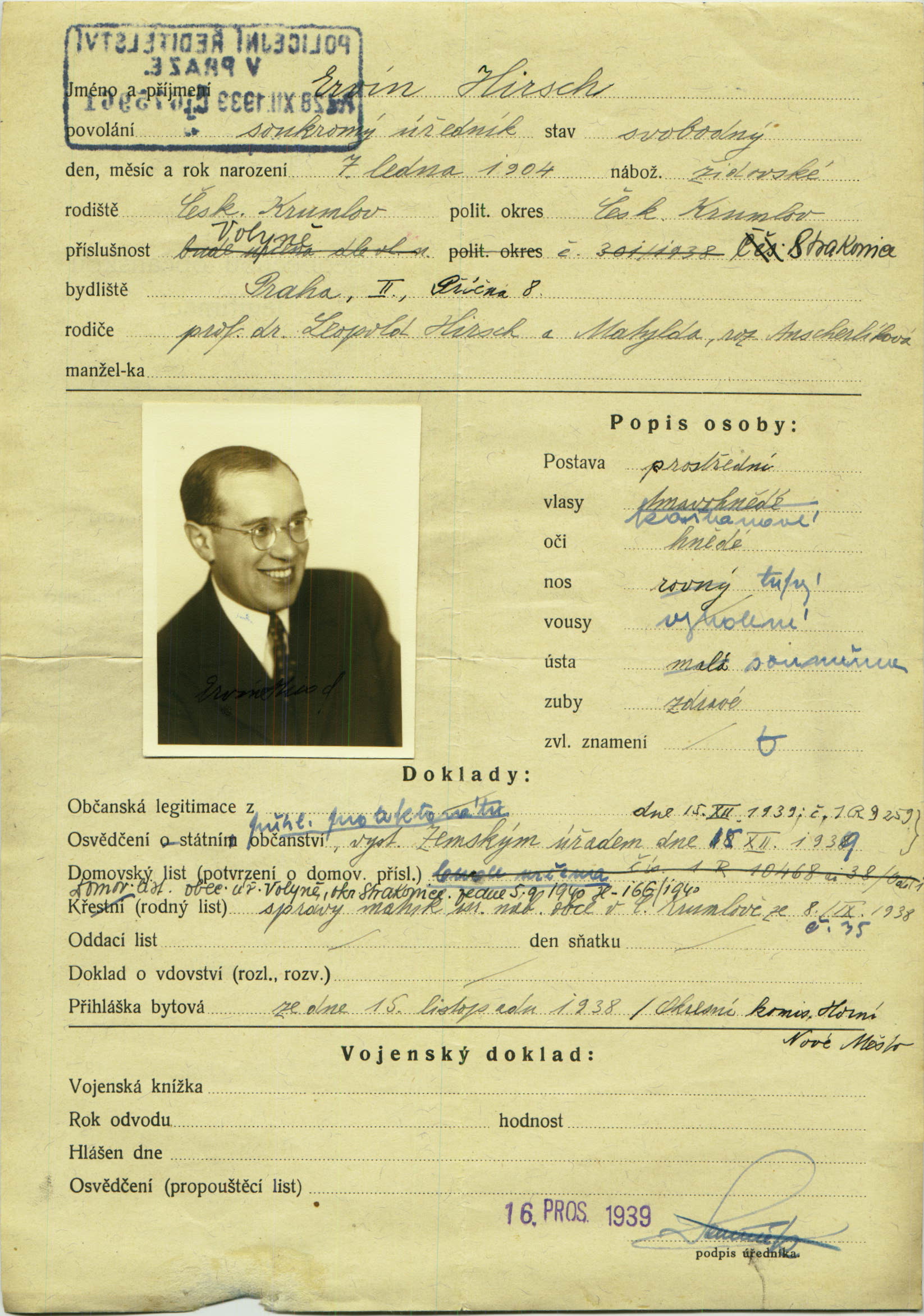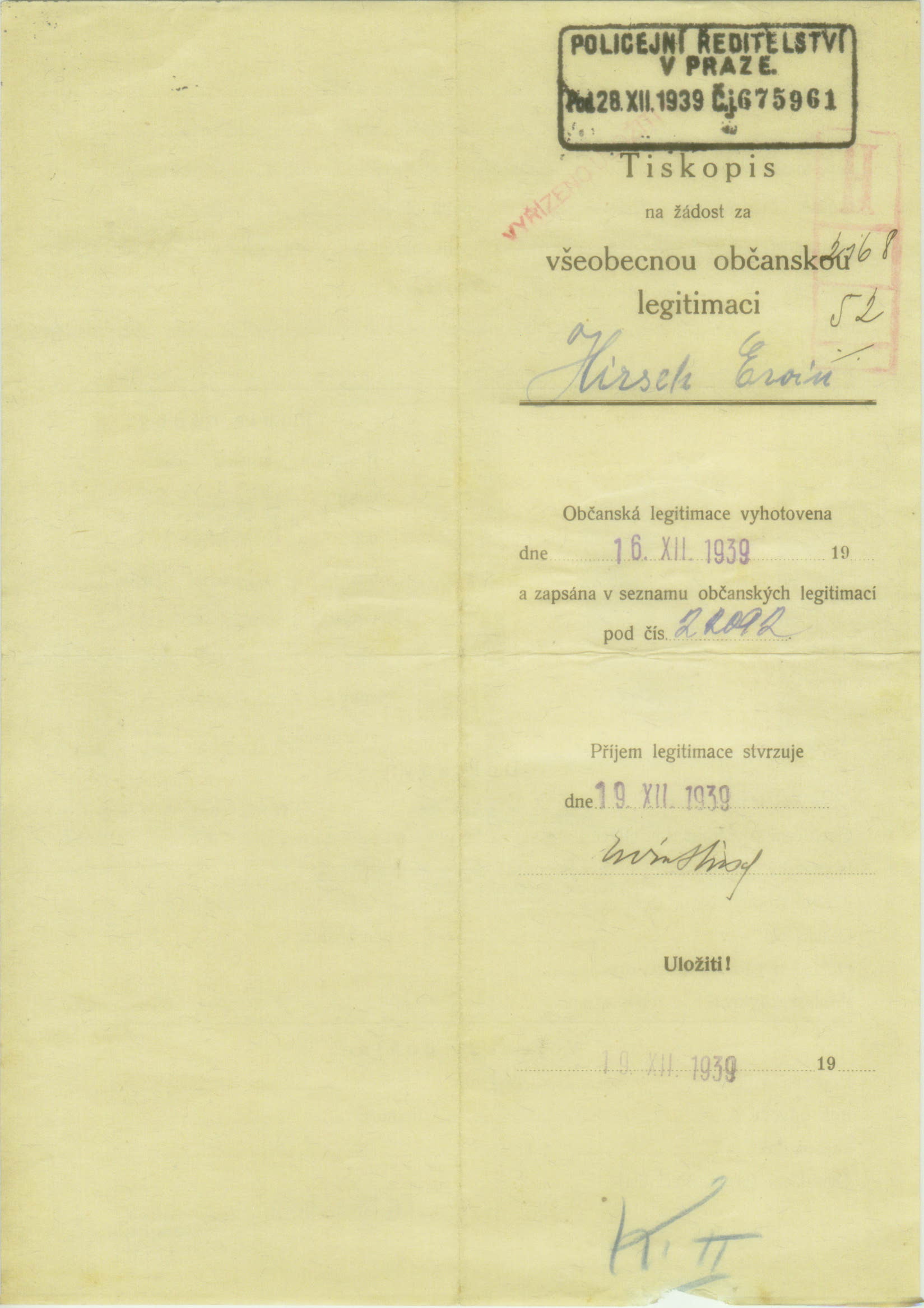 Hirsch Ervín: Žádost o vydání občanské legitimace