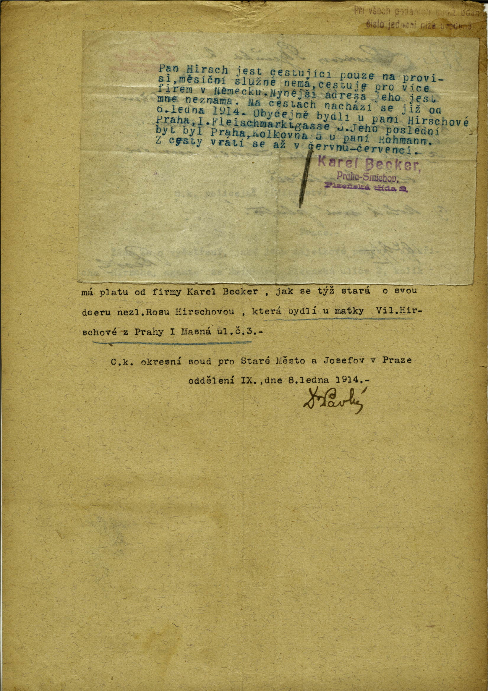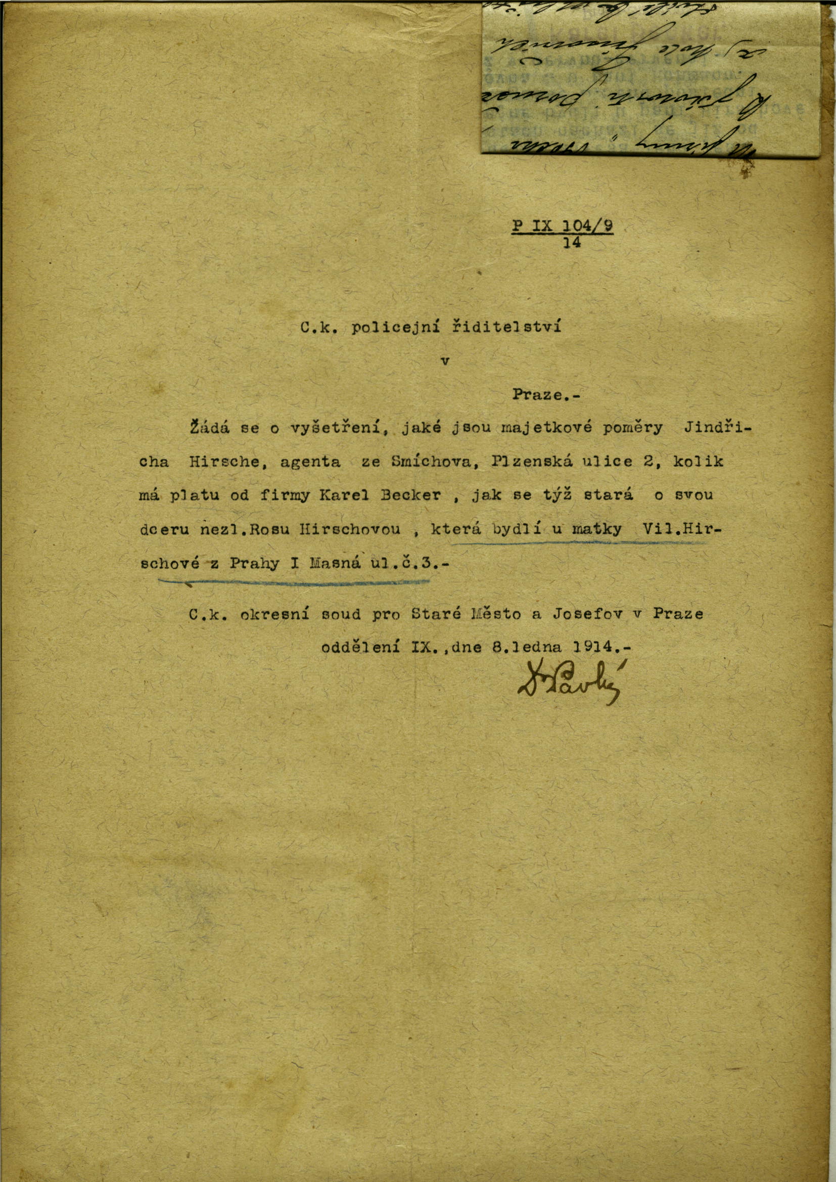 Hirsch Jindřich: Šetření o majetkových poměrech