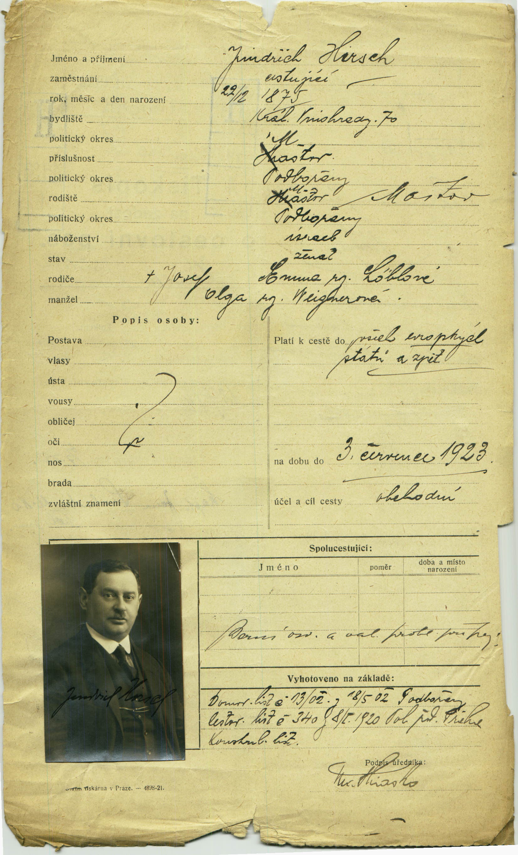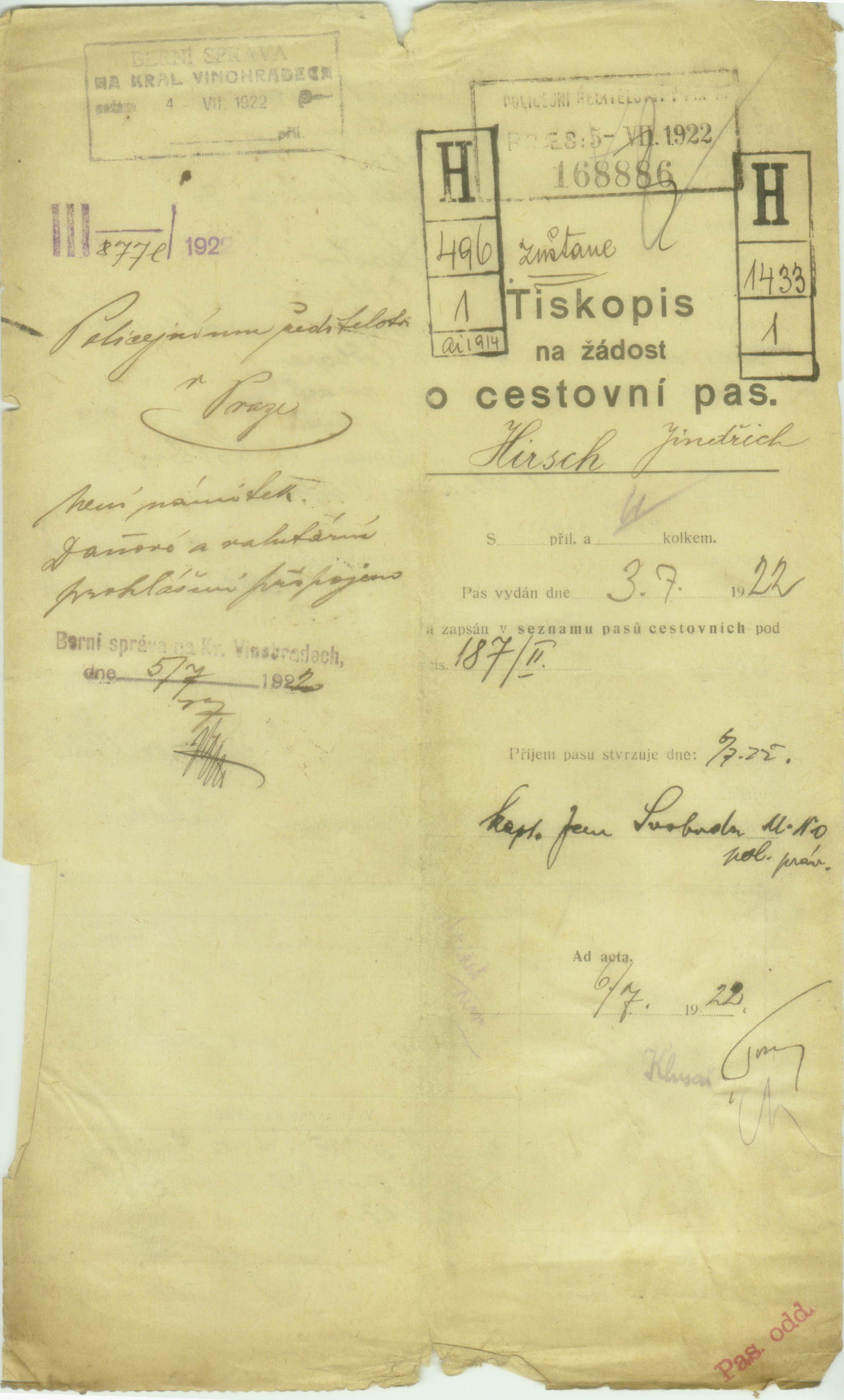 Hirsch Jindřich: Žádost o vydání cestovního pasu