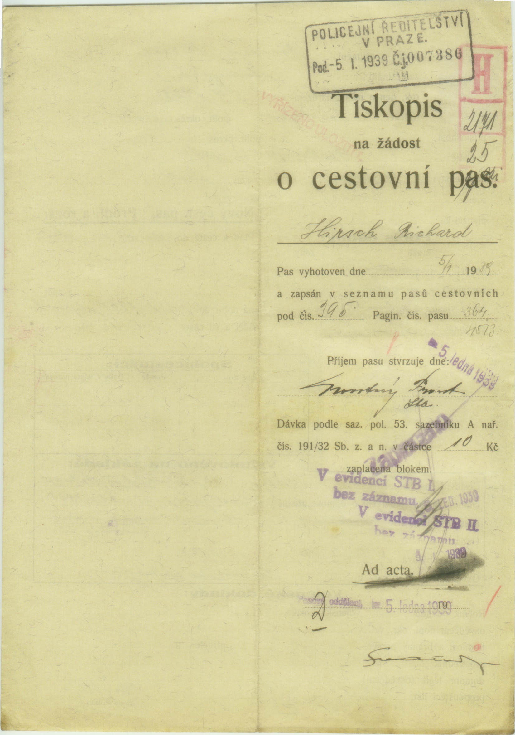 Hirsch Richard: Žádost o vydání cestovního pasu