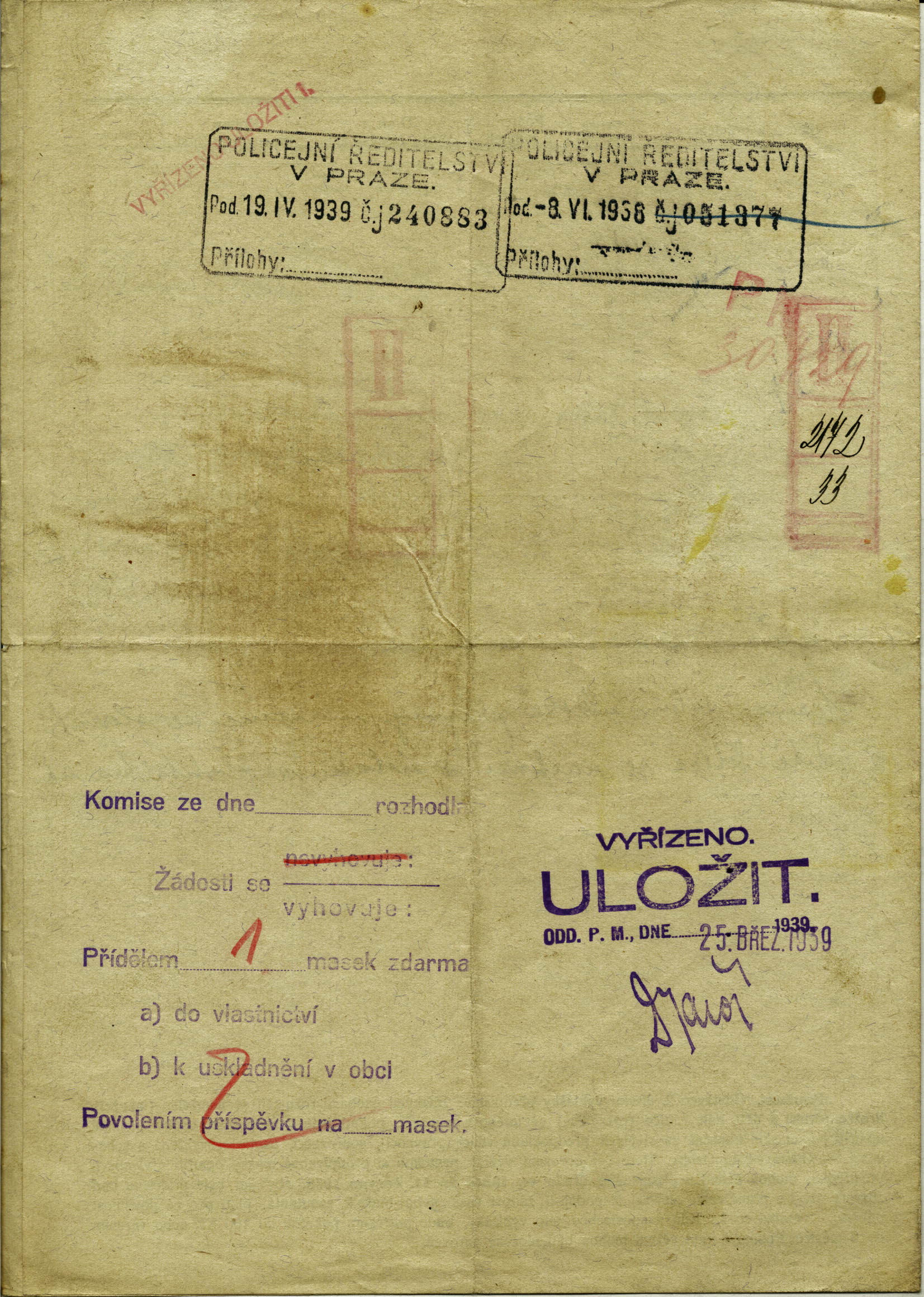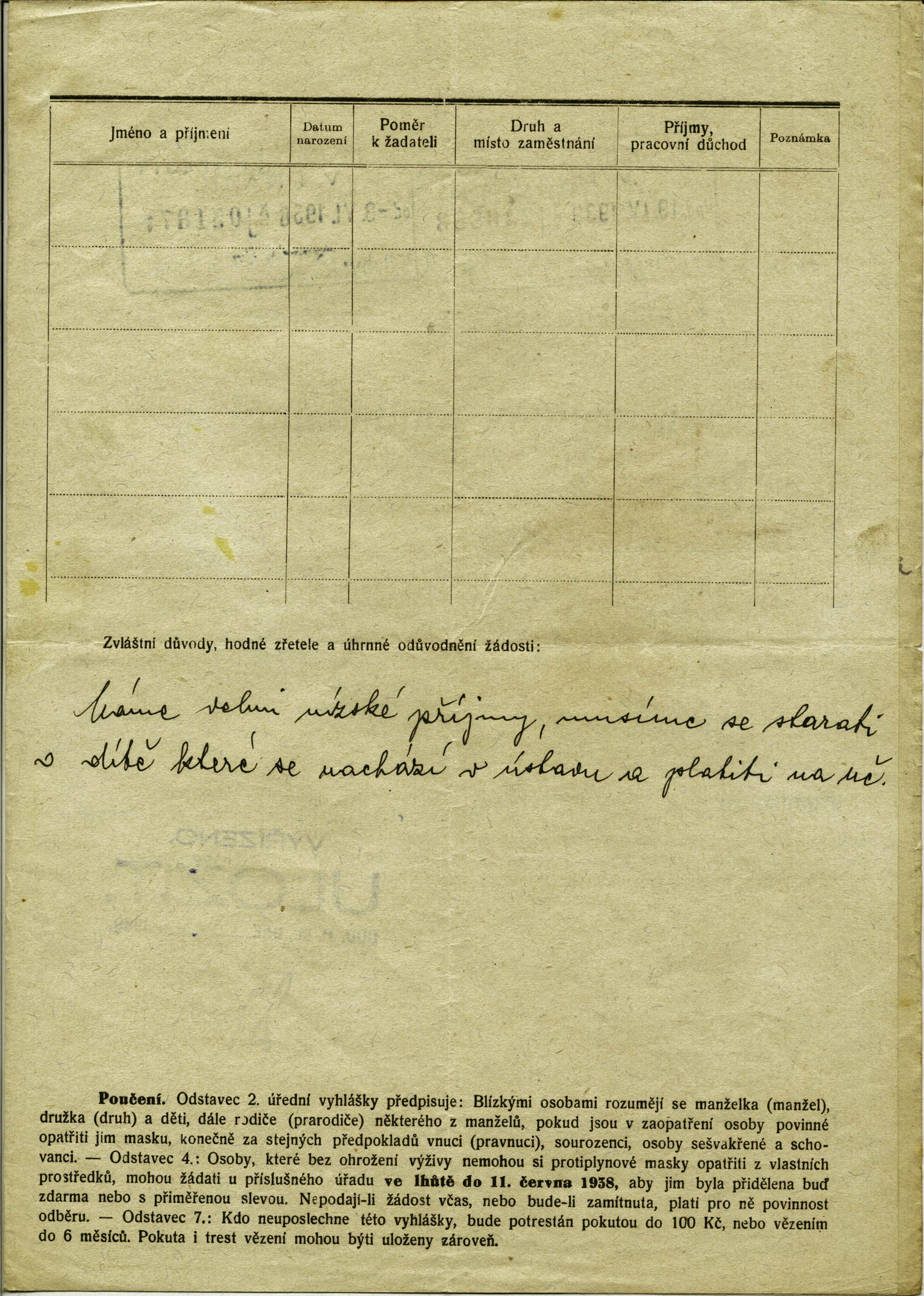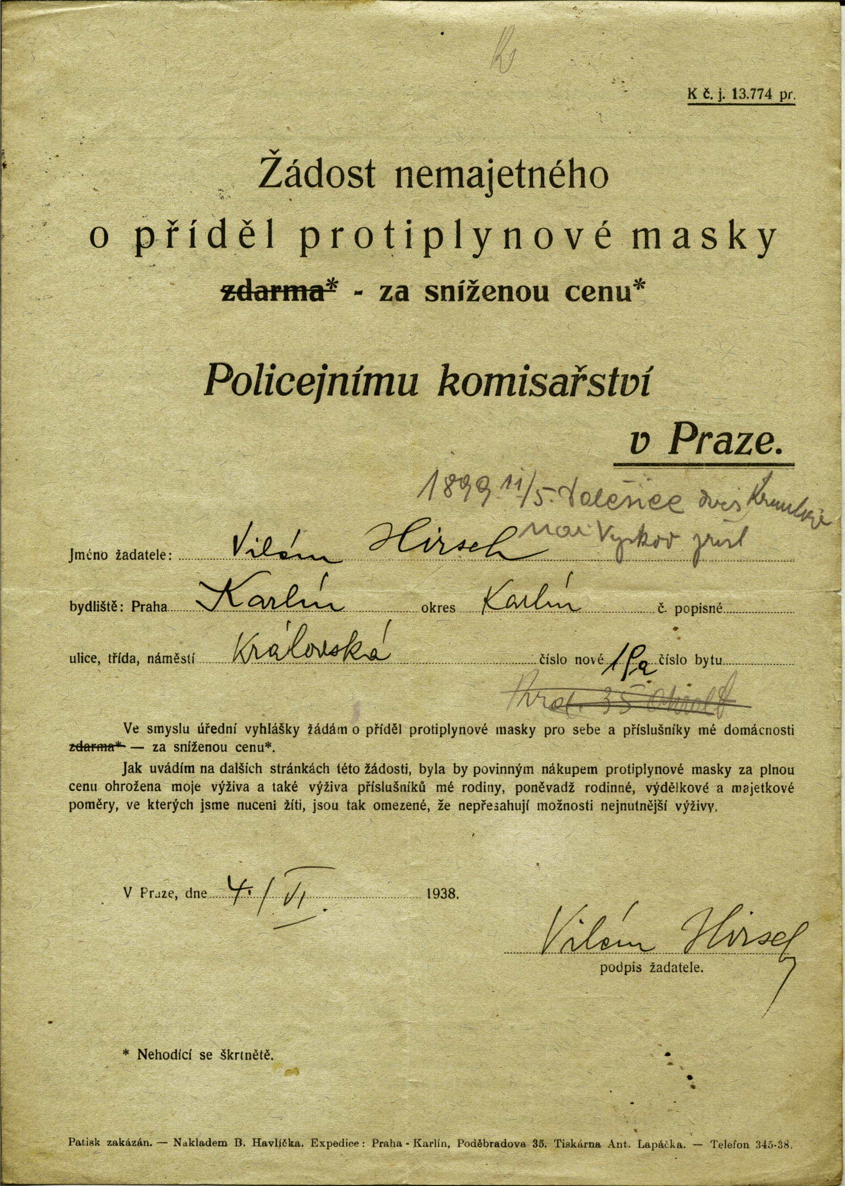 Hirsch Vilém: Žádost o přidělení plynové masky