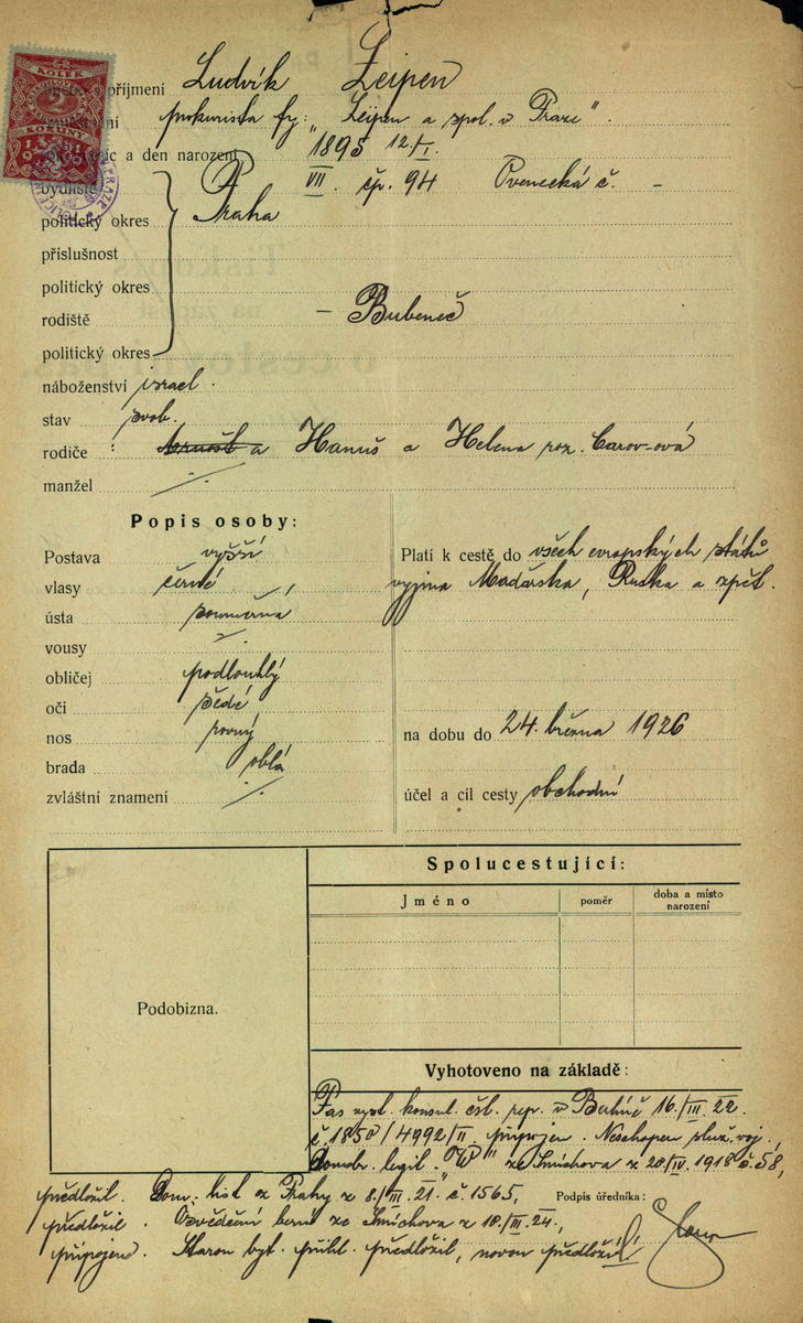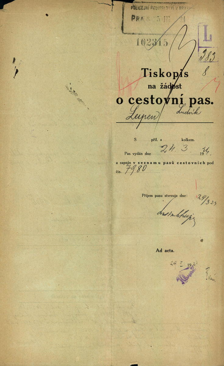 Leipen Ludvík: Žádost o vydání cestovního pasu