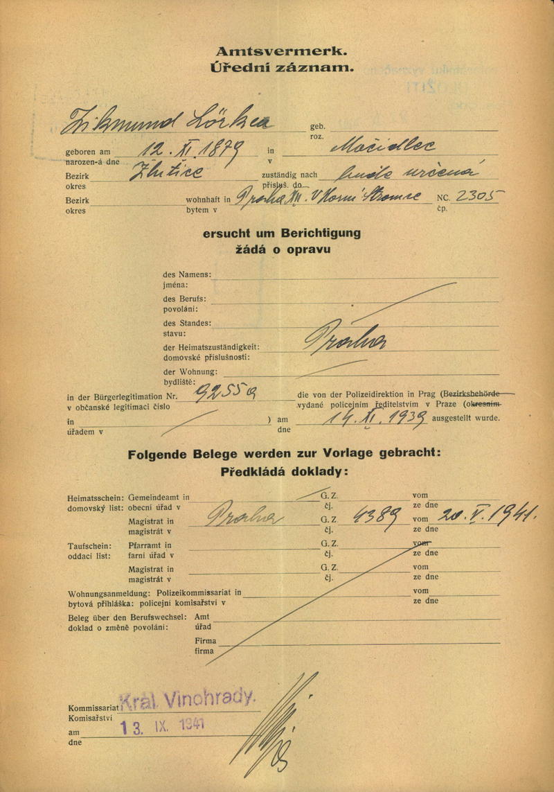 Lörken Zikmund: Žádost o opravu v občanské legitimaci
