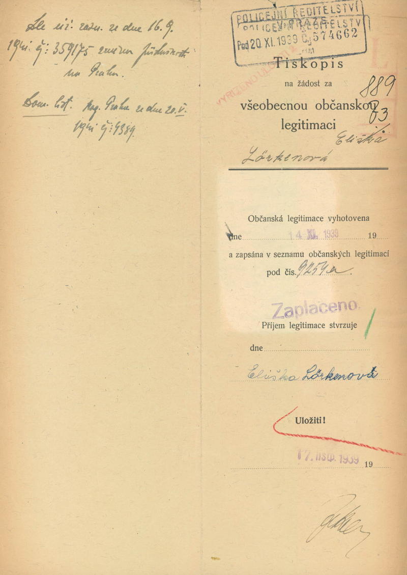 Lörkenová Eliška: Žádost o vydání občanské legitimace