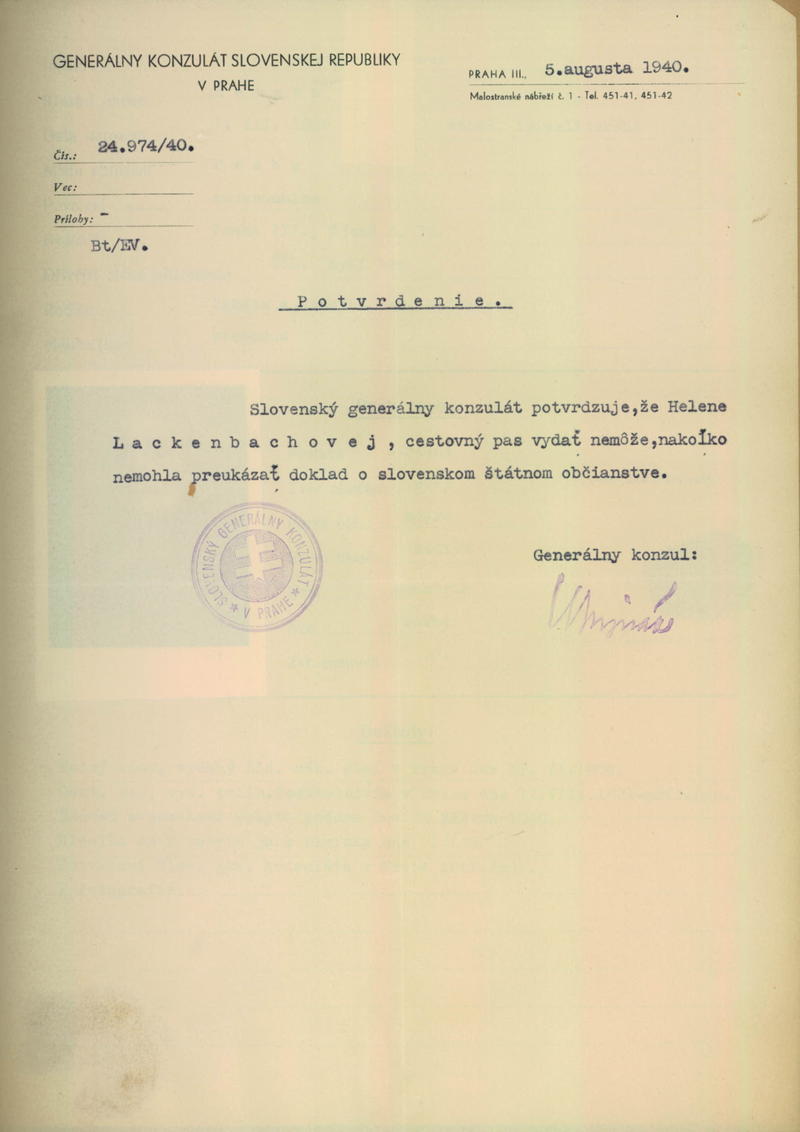Lackenbachová Helena: Zamítnutí žádosti o vydání cestovního pasu