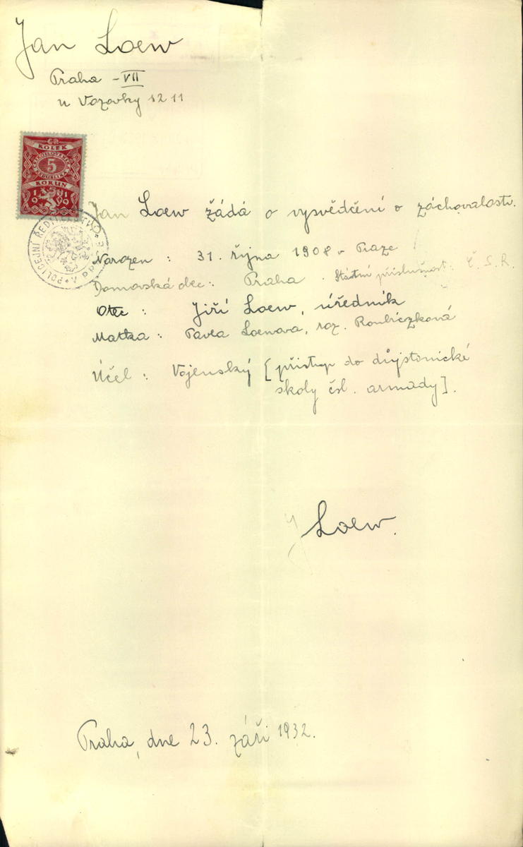 Löw Hanuš: Žádost o vystavení vysvědčení zachovalosti