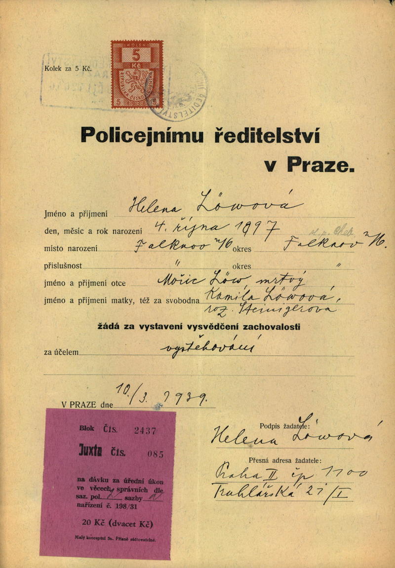 Löwová Helena: Žádost o vystavení vysvědčení zachovalosti