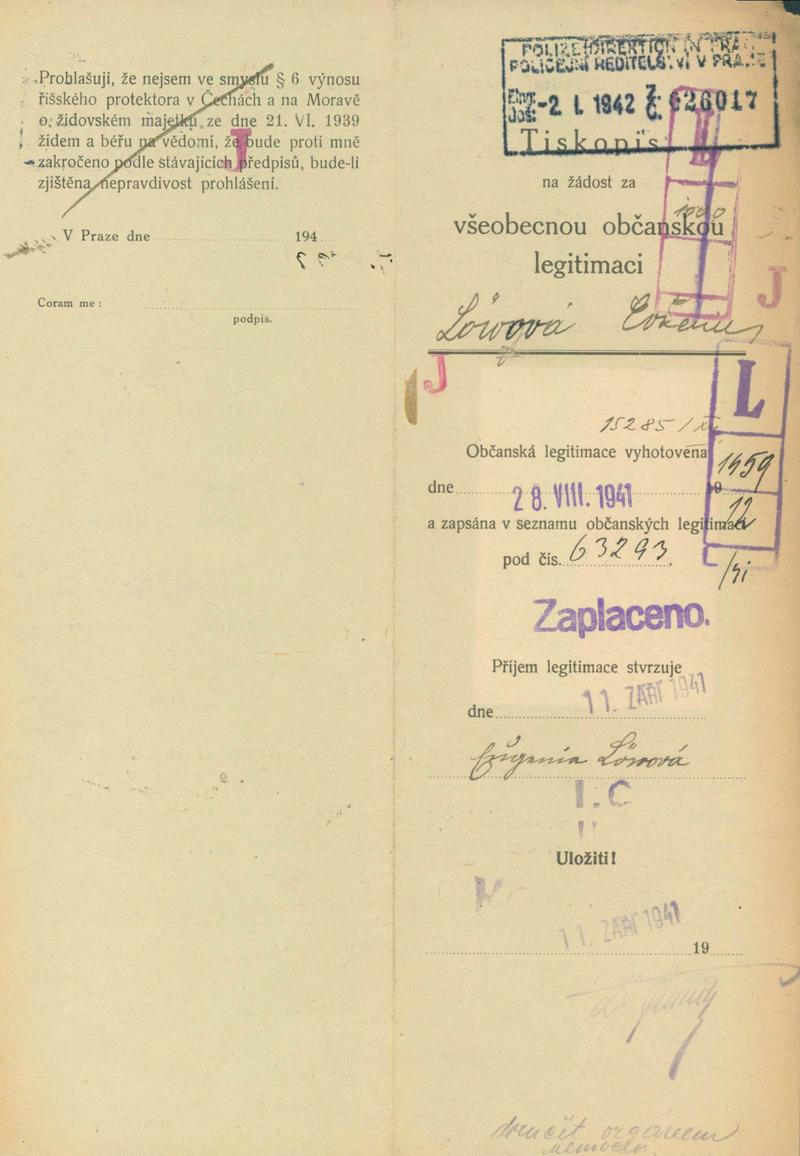 Löwová Evženie: Žádost o vydání občanské legitimace