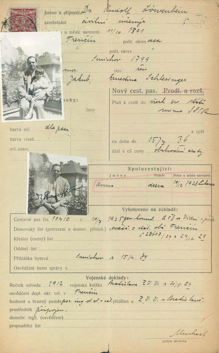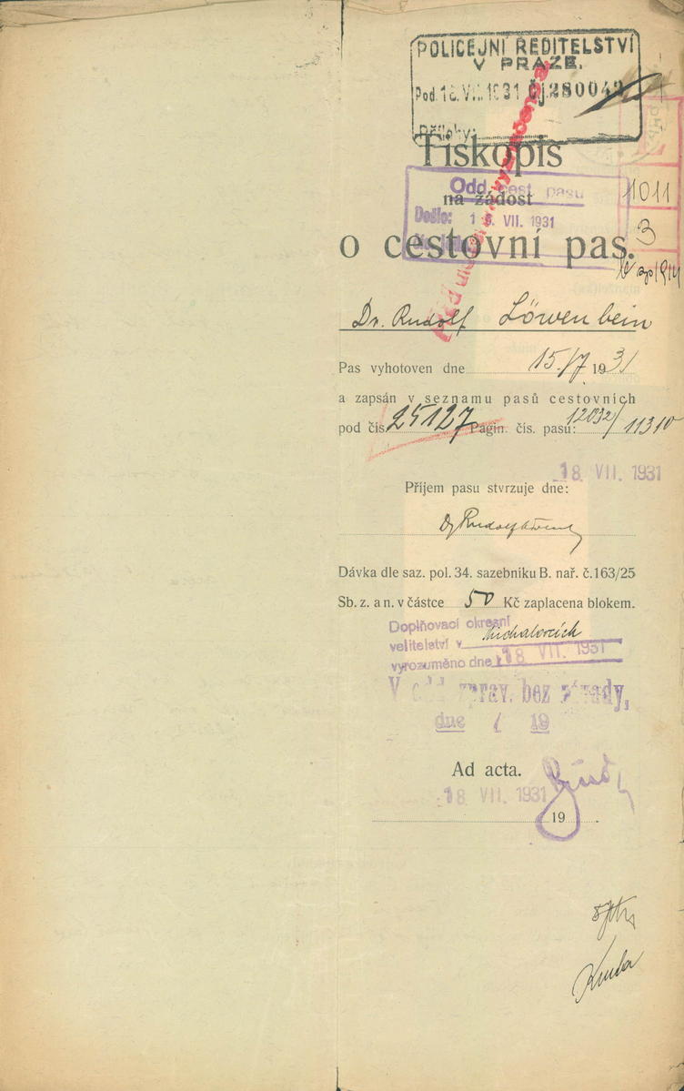 Löwenbein Rudolf: Žádost o vydání cestovního pasu