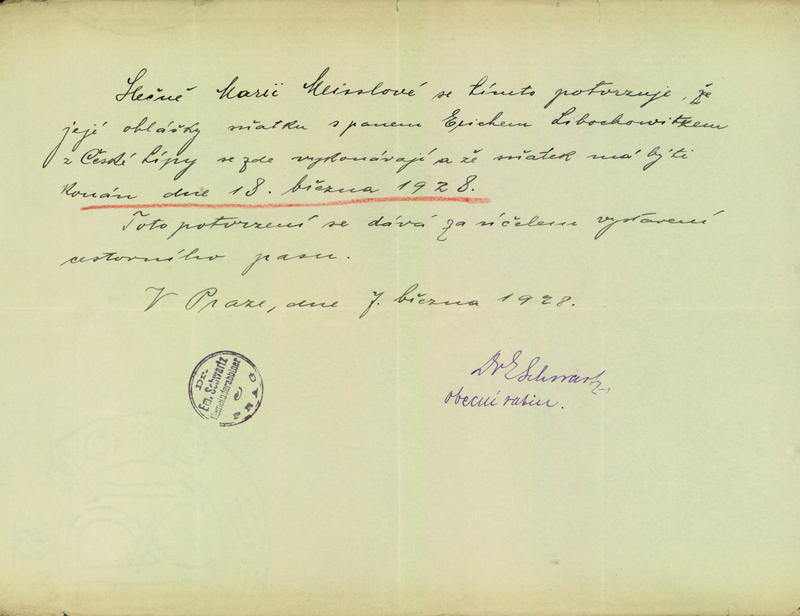 Libochowitzová Marie: Potvrzení o chystaném sňatku