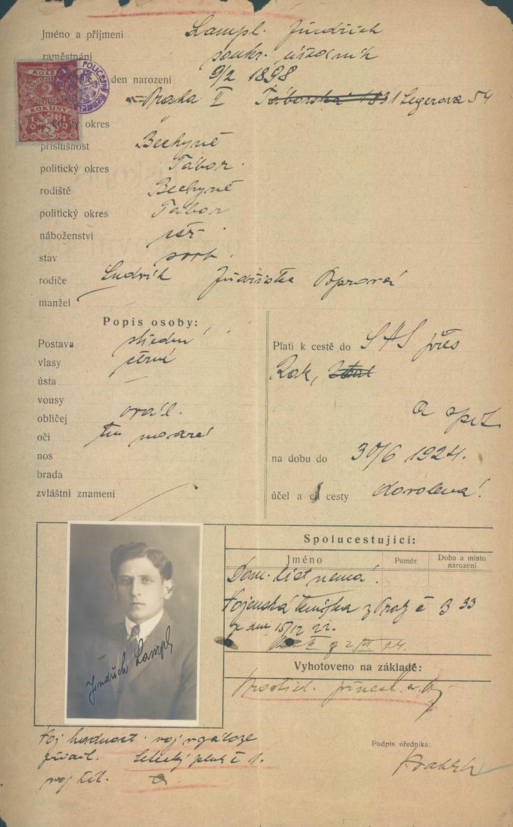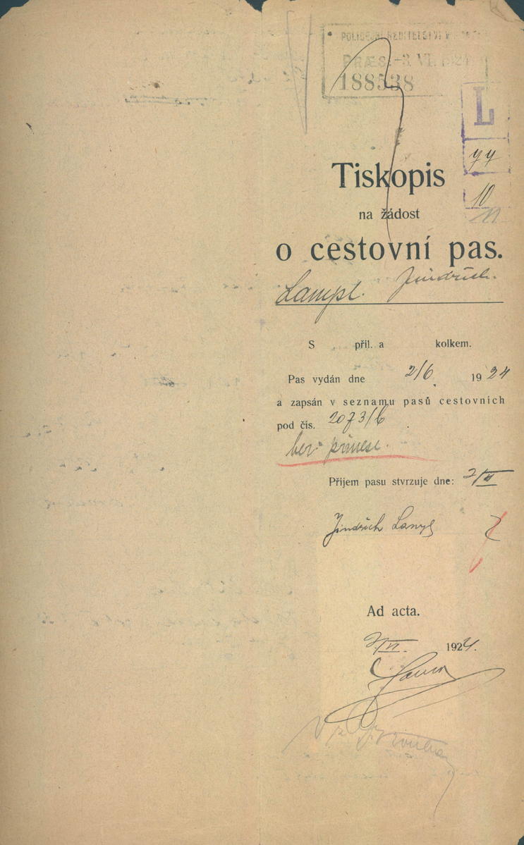 Lampl Jindřich: Žádost o vydání cestovního pasu