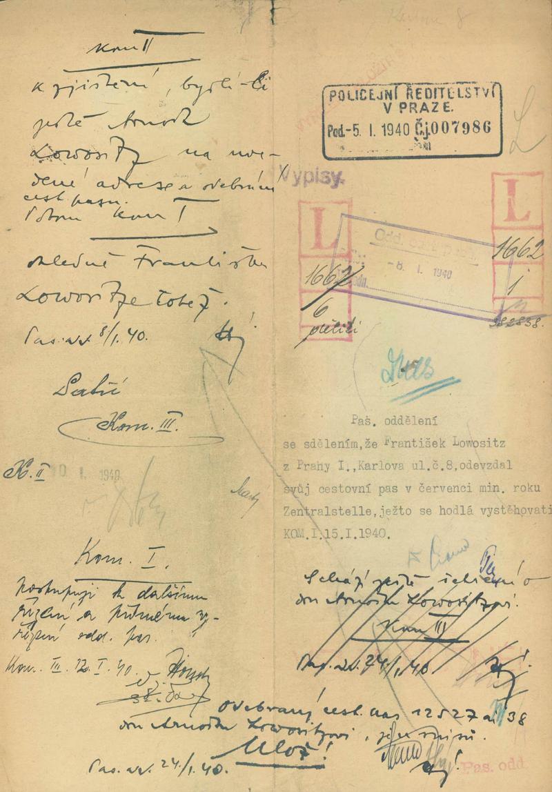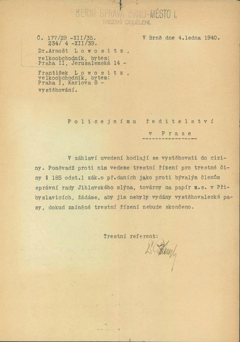 Lowositz Arnošt: Žádost o nevydání vystěhovaleckých pasů ve věci trestního řízení