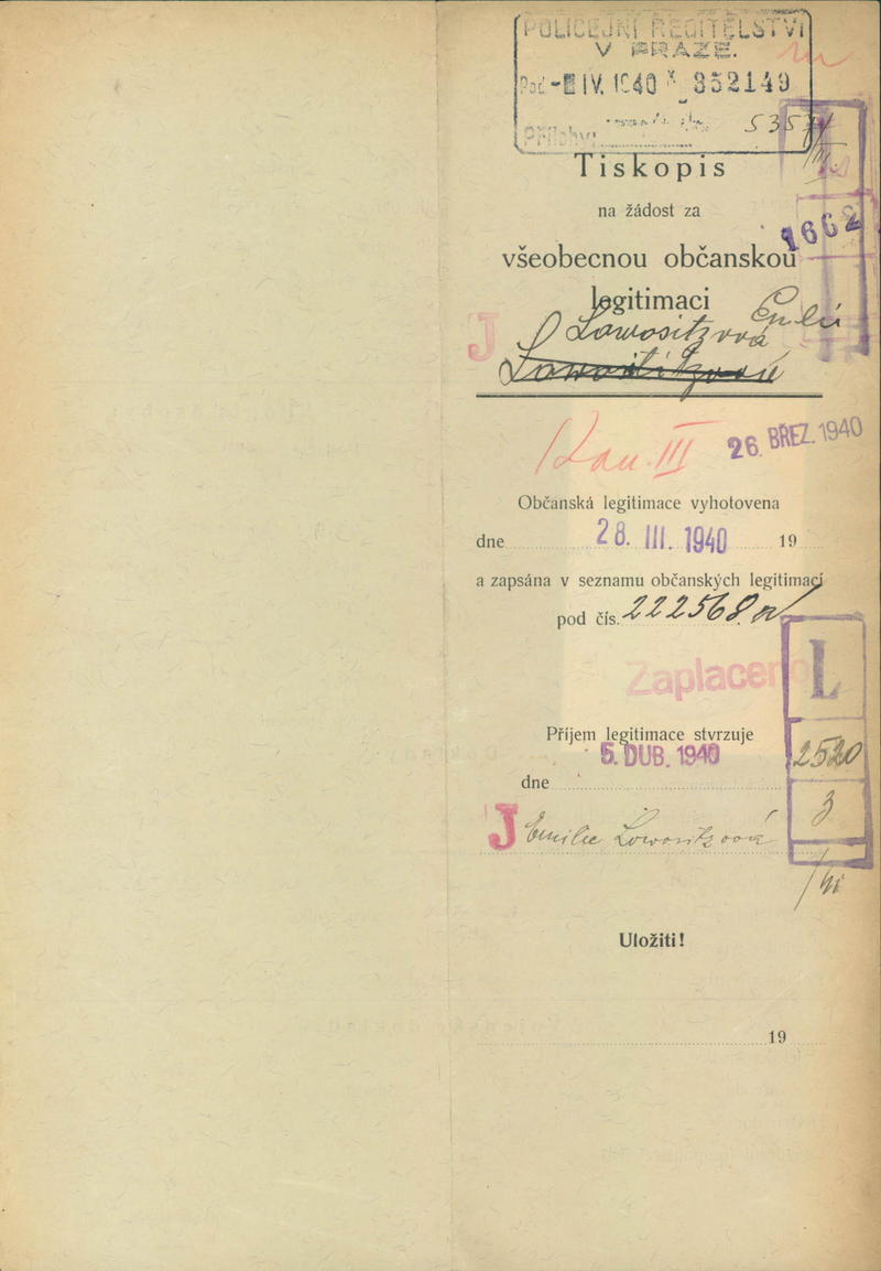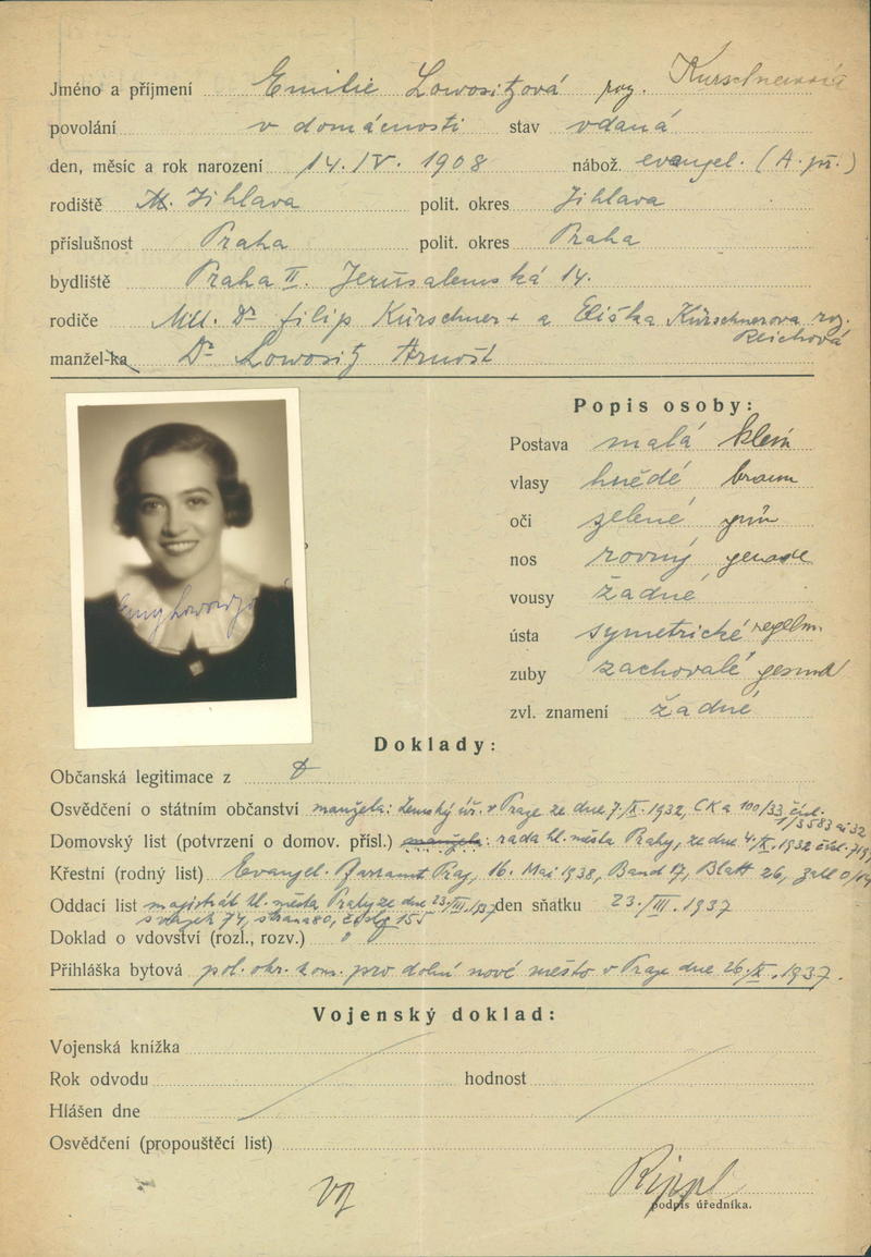 Lowositzová Emilie: Žádost o vydání občanské legitimace