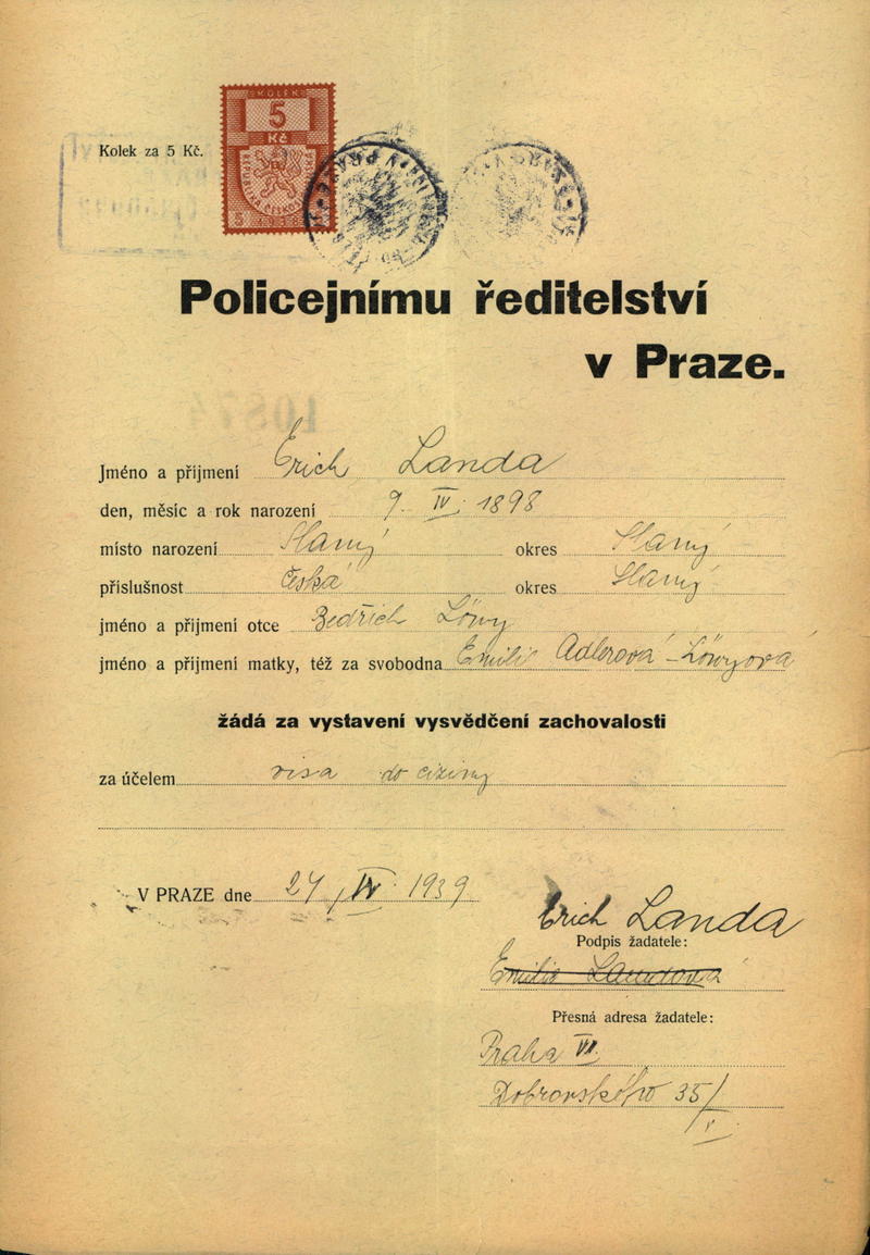 Landa Erich: Žádost o vystavení vysvědčení zachovalosti