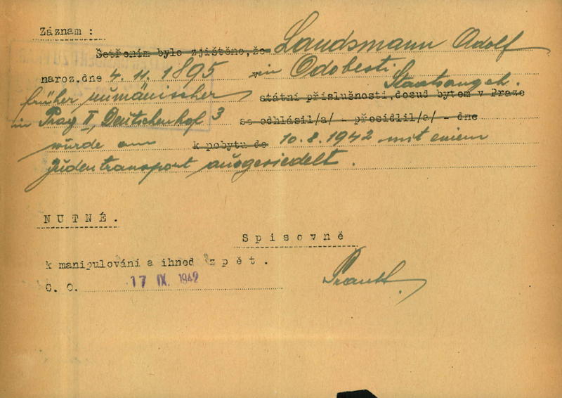 Landsmann Adolf: Šetření o pobytu odtransportovaných Židů