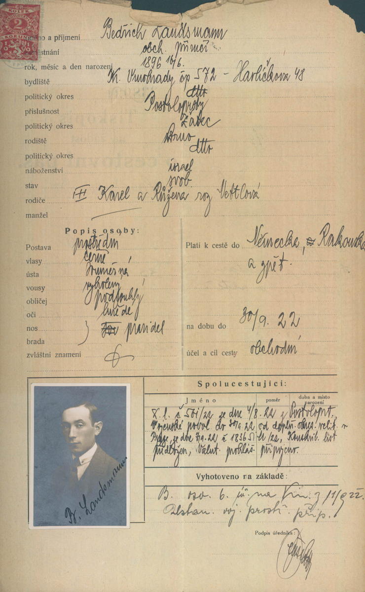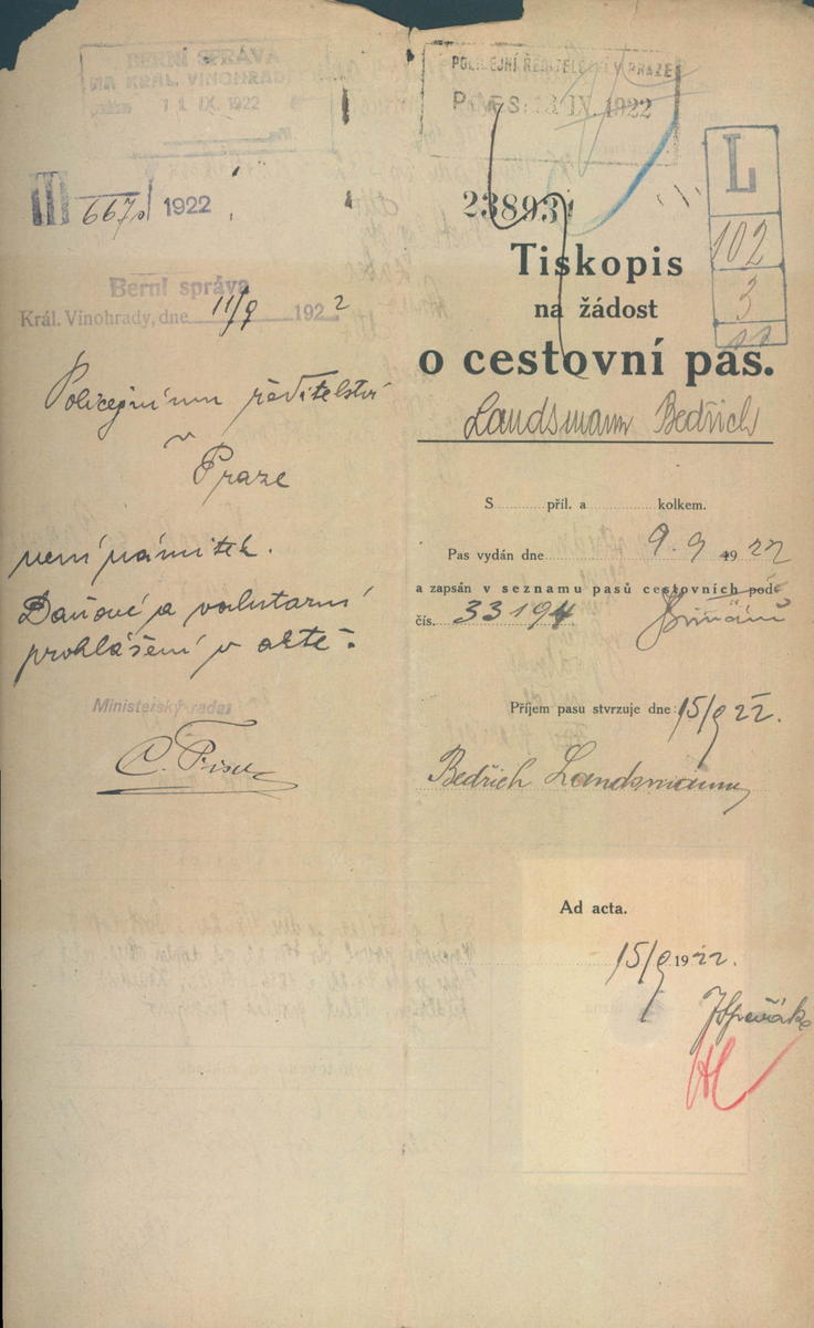 Landsmann Bedřich: Žádost o vydání cestovního pasu