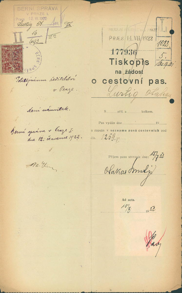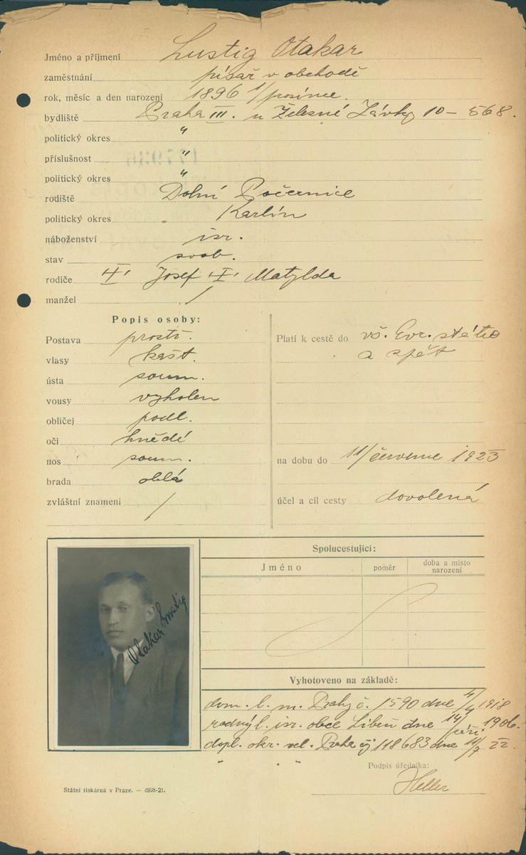 Lustig Otakar: Žádost o vydání cestovního pasu