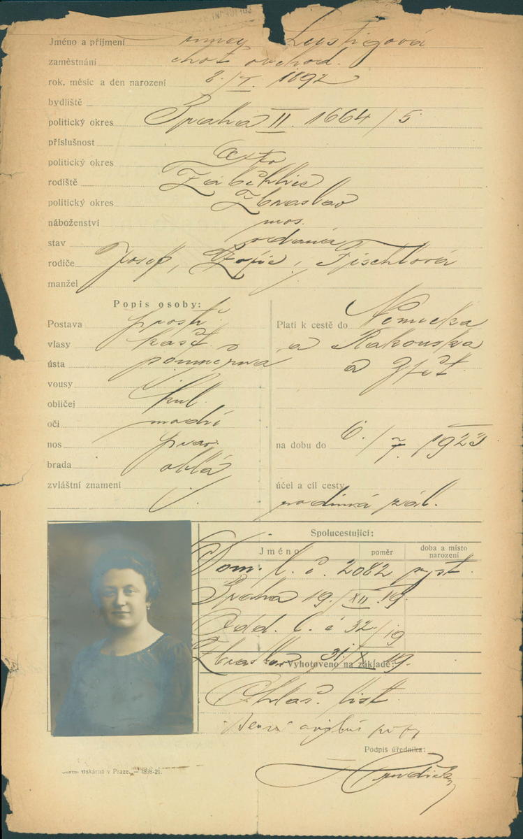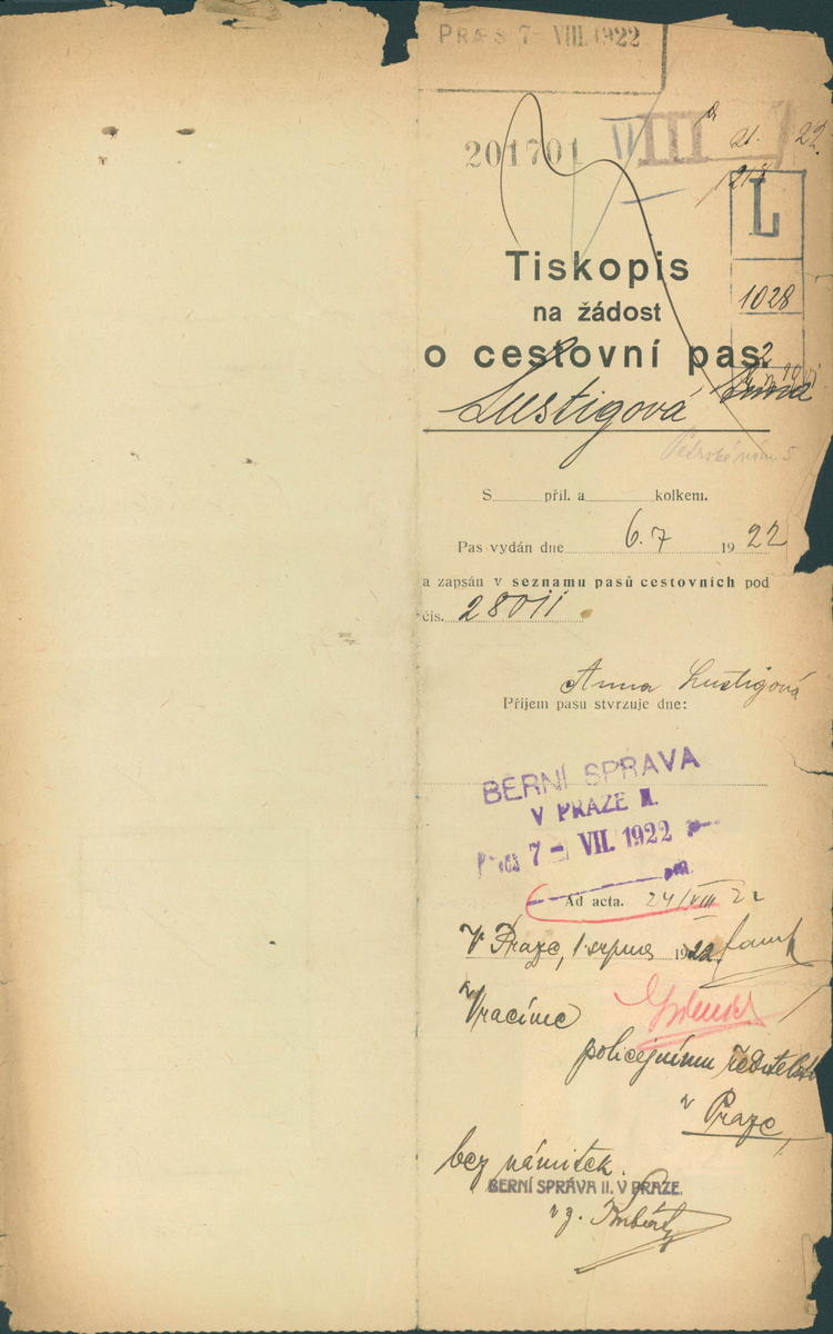 Lustigová Anna: Žádost o vydání cestovního pasu