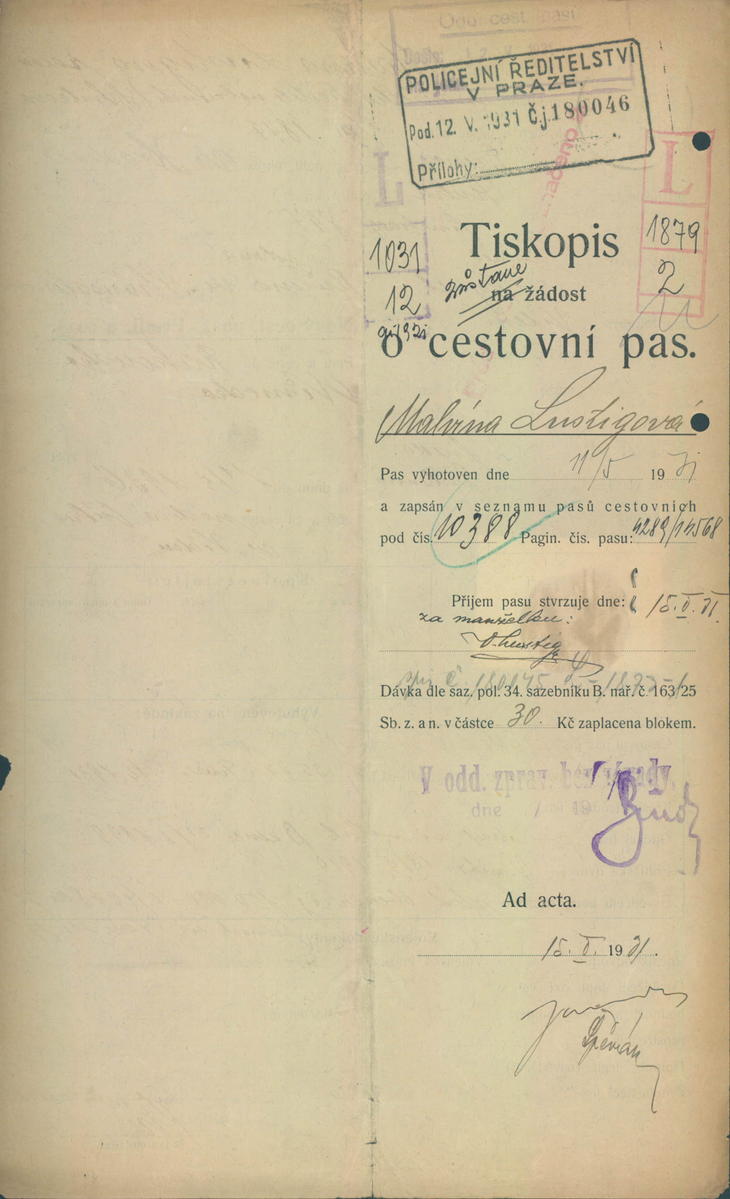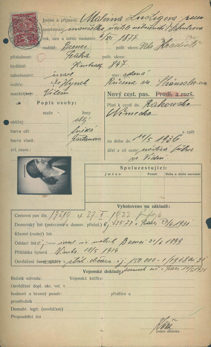 Lustigová Malvína: Žádost o vydání cestovního pasu