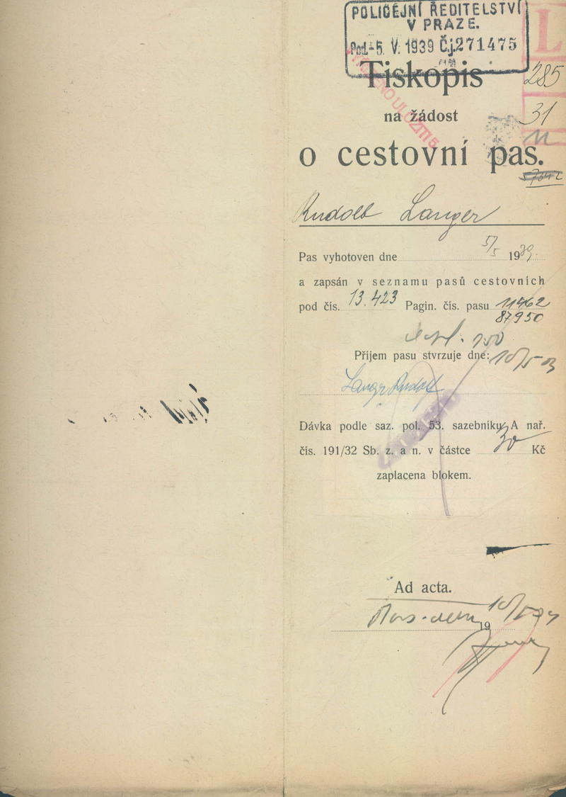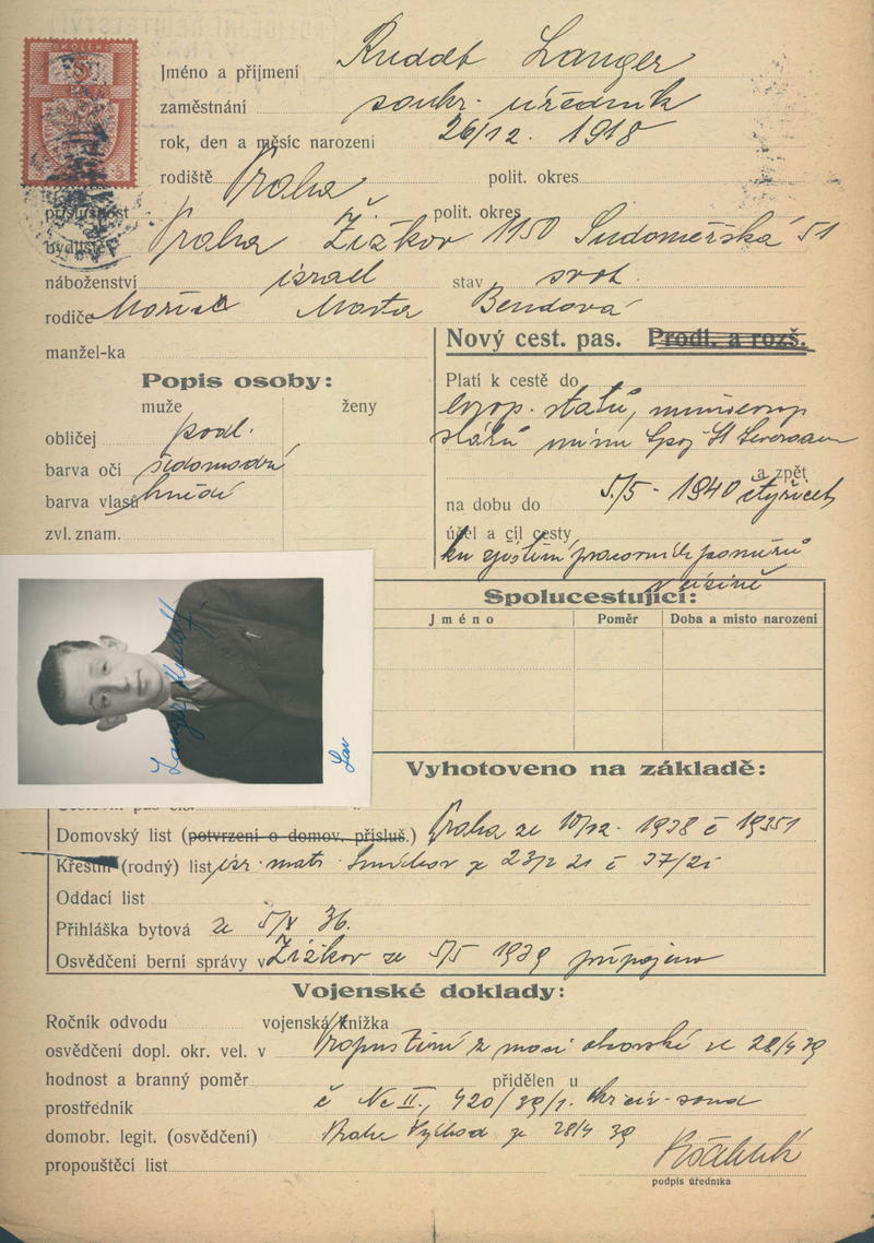 Langer Rudolf: Žádost o vydání cestovního pasu