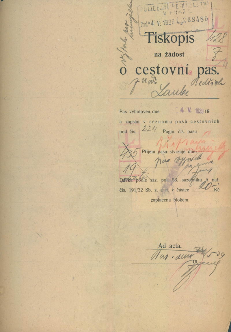 Laube Bedřich: Žádost o připsání manželky do cestovního pasu