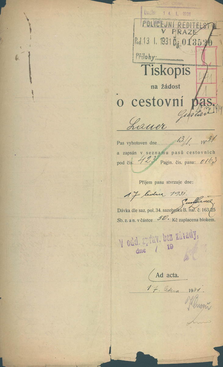 Lauer Gustav: Žádost o vydání cestovního pasu