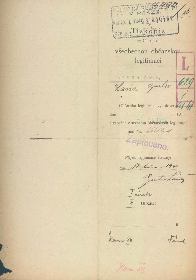 Lauer Gustav: Žádost o vydání občanské legitimace