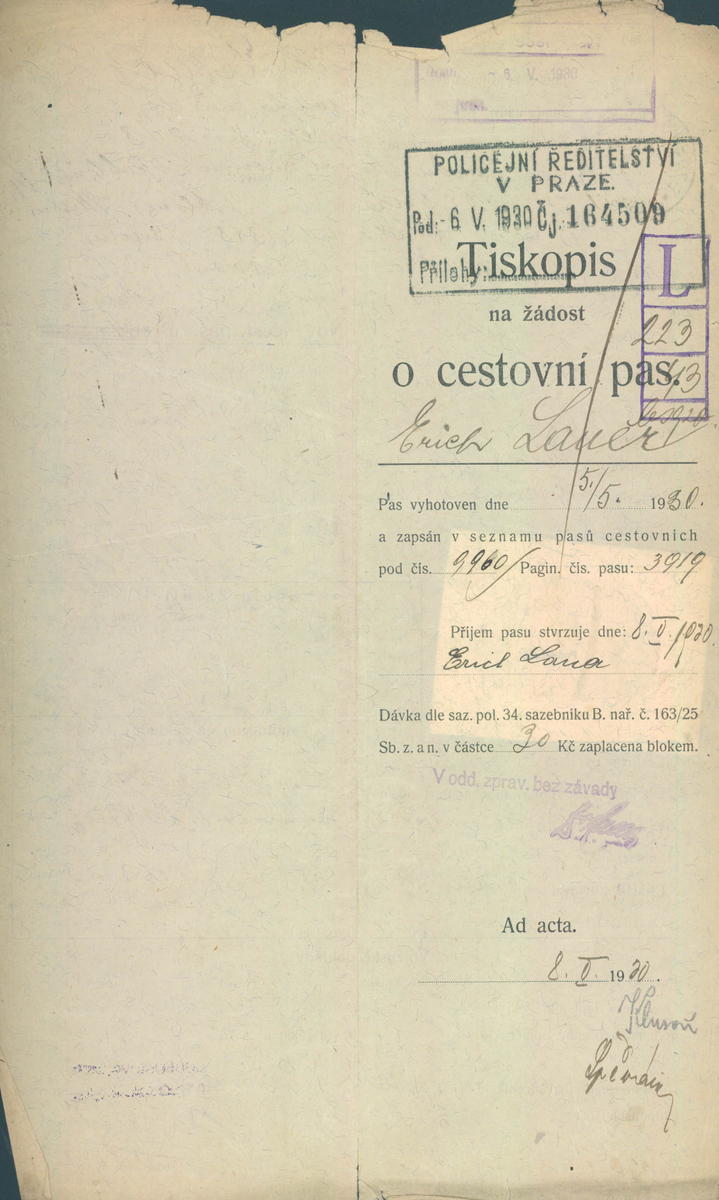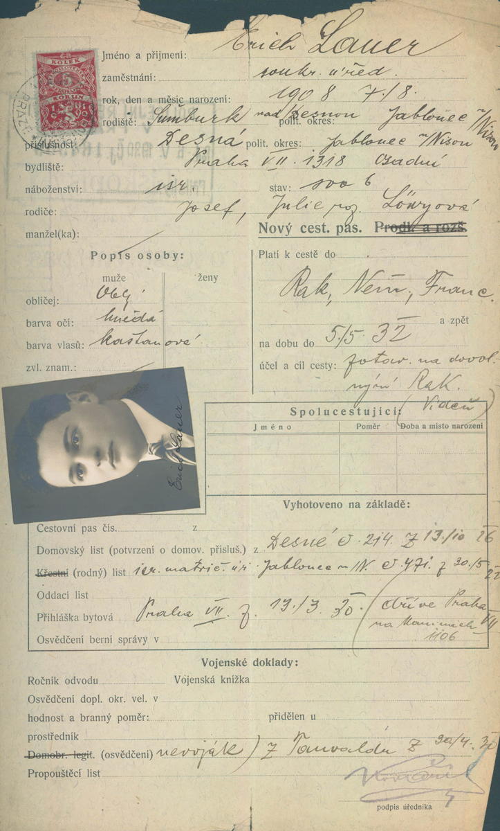 Lauer Erich: Žádost o vydání cestovního pasu