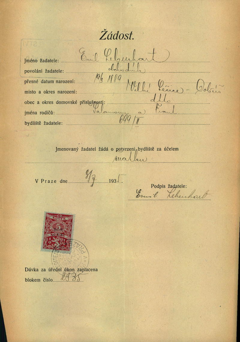 Lebenhart Emil: Žádost o potvrzení pobytu