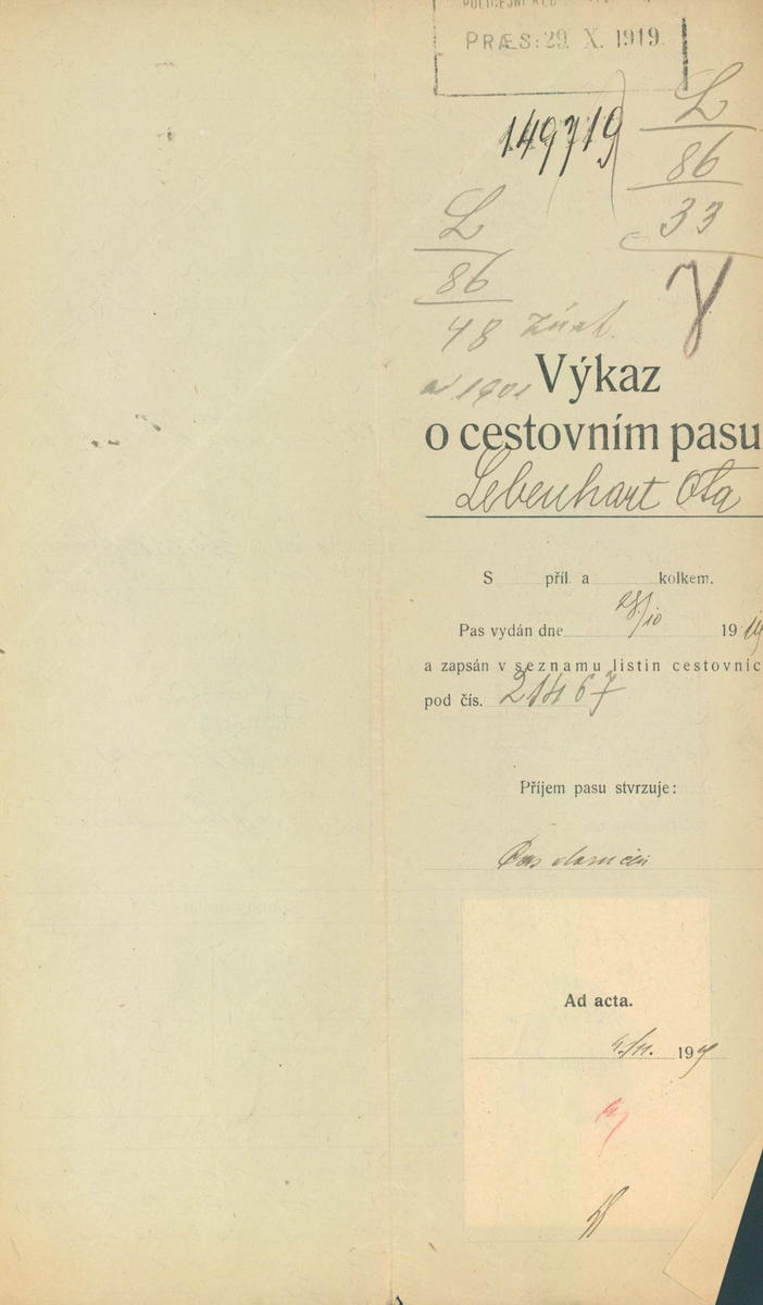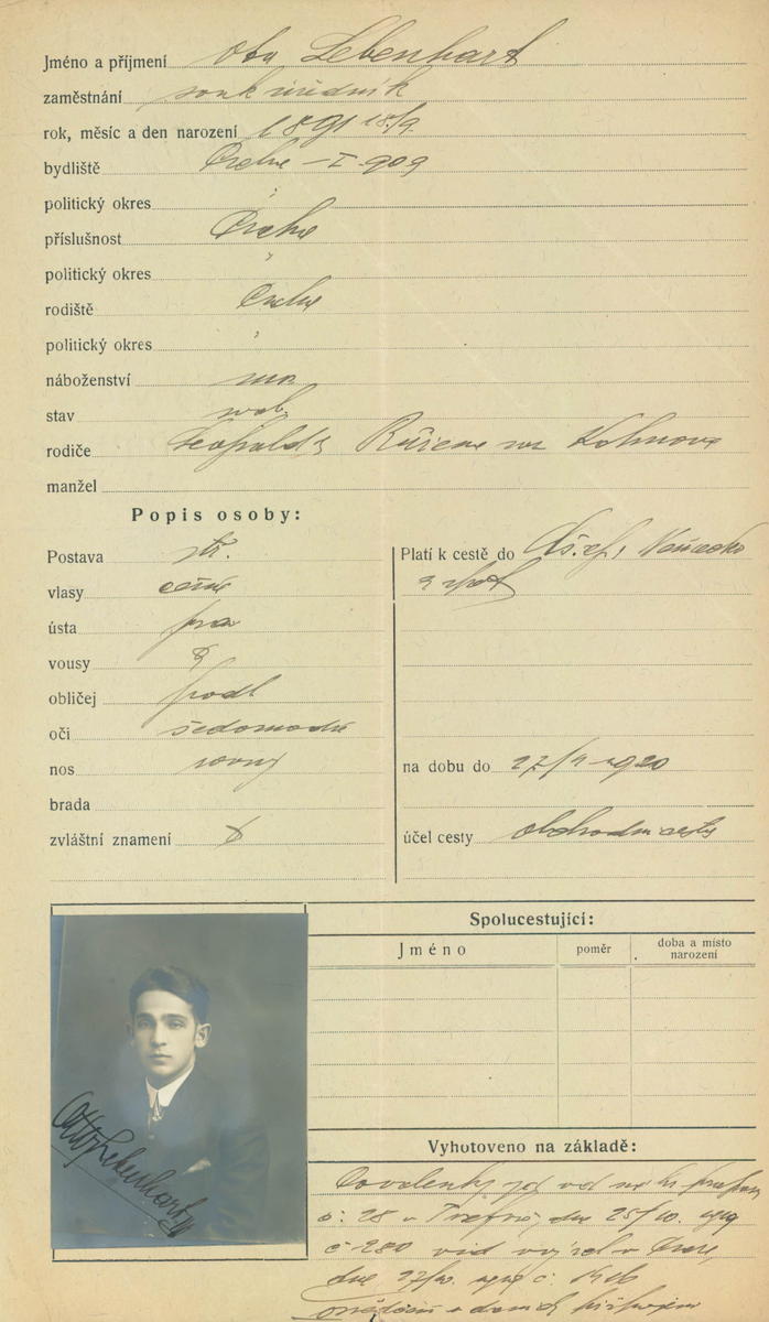 Lebenhart Otto: Žádost o vydání cestovního pasu