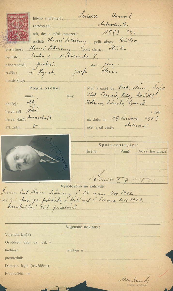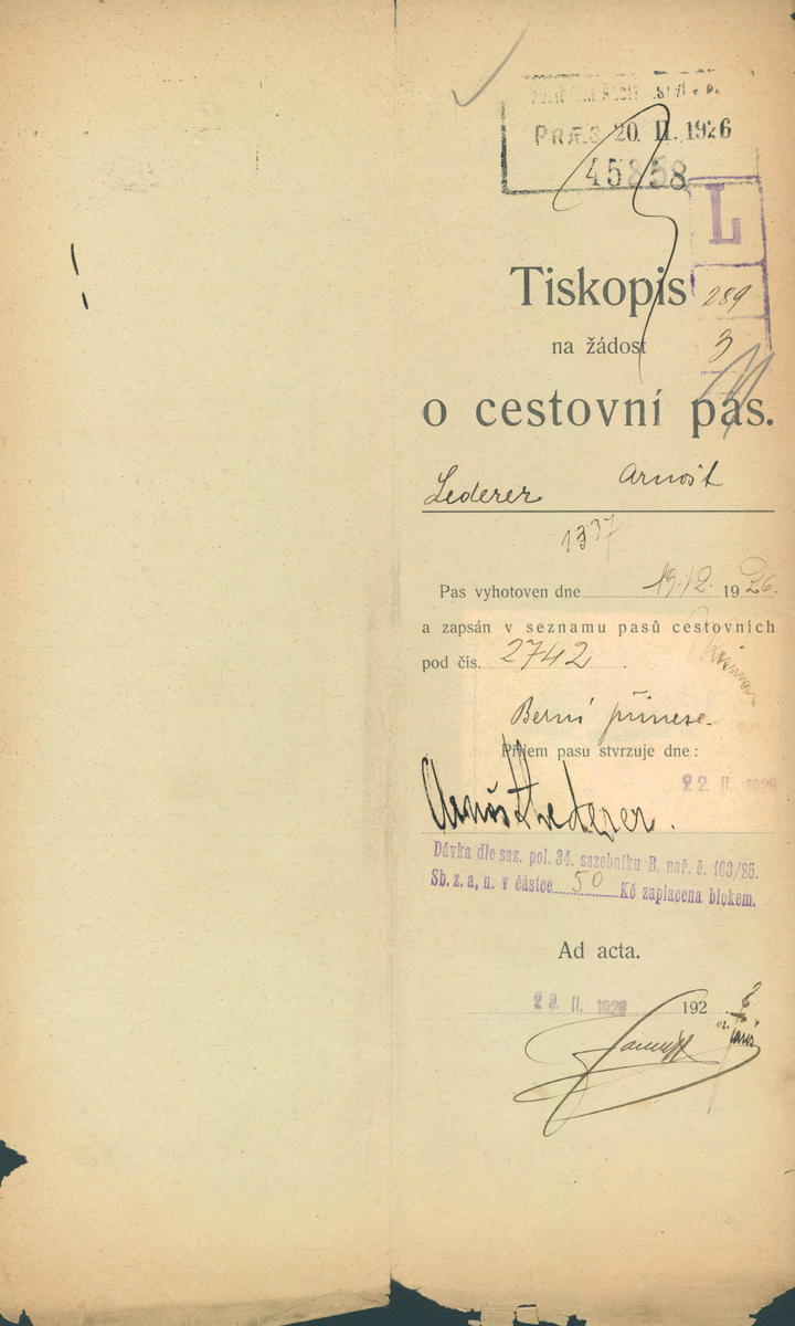 Lederer Arnošt: Žádost o vydání cestovního pasu