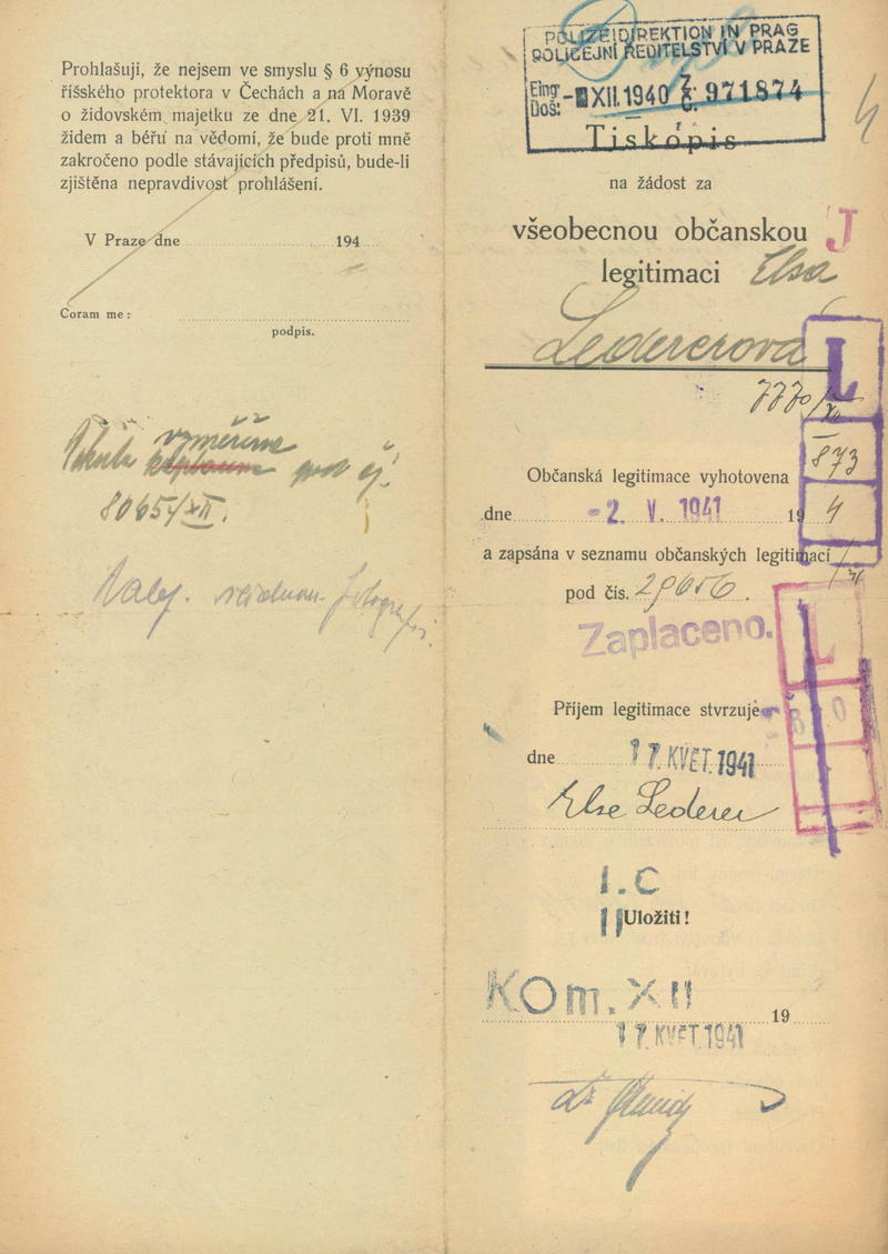 Ledererová Eliška: Žádost o vydání občanské legitimace